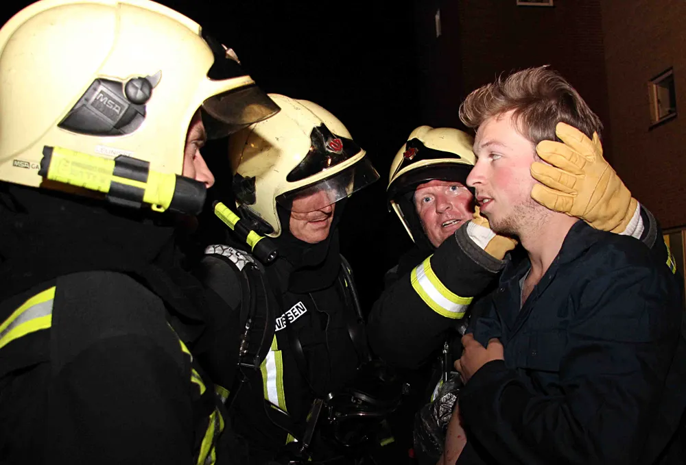 Zodra de brandweer arriveerdekon veiligheidsfunctionaris en bewoner Hans Brugman deze exact van de situatie op de hoogte brengen. Vanwege de rookontwikkeling werd de gewonde man niet per brancard afgevoerd -deze handeling duurt te lang-, maar 'weggesleept' door de brandweerlieden. In die zin kan iemand beter krimpen van de pijn, dan sterven door de rook.