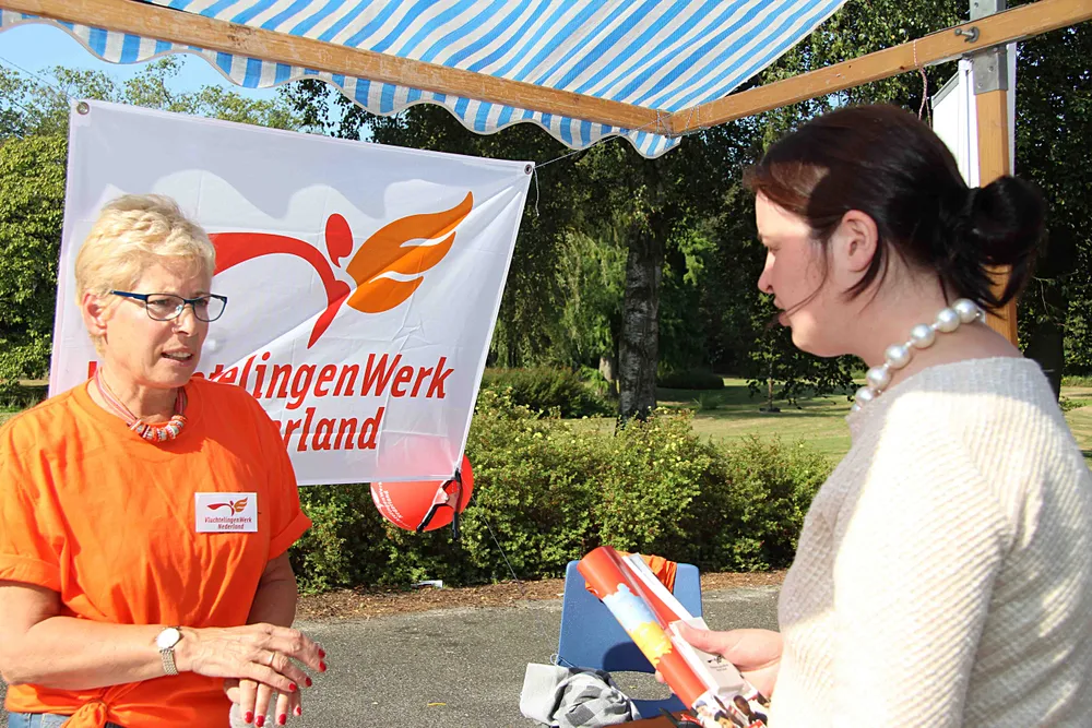 Rob Hurink informeerde belangstellend publiek namens Vluchtelingenwerk Ermelo.Deze organisatie houdt zich voornamelijk bezig met de maatschappelijke begeleiding van vluchtelingen met een status, gedurende 8 maanden. Ook aan opvanglocatie De Hooge Riet levert Vluchtelingenwerk Ermelo een bijdrage. "Wij helpen bijvoorbeeld met een vervolg geven aan gezinshereniging van jongeren die dat willen. Zodra ze hier komen helpen wij mee de procedure op te starten. Daarnaast helpen wij mee het vluchtelingenverhaal in kaart te brengen. Met andere woorden; wij zoeken uit of ze hier volgens de regels mogen zijn."
