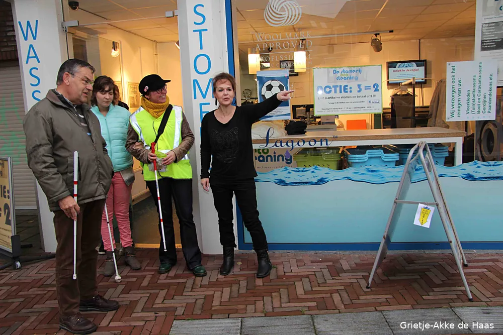 Het groepje prijst Geurt Jansen Verf & Wand.Alies: "Ik train visueel beperkten om te lopen met een witte stok, dus we komen hier geregeld langs. Ook Geurt Jansen had de de spullen precies tot aan de rand van de geleidelijn uitgestald. Tot een medewerker ons een keer zag stuntelen tijdens een training. De uitstalling is toen meteen een stuk verder van de geleidelijn af gezet."