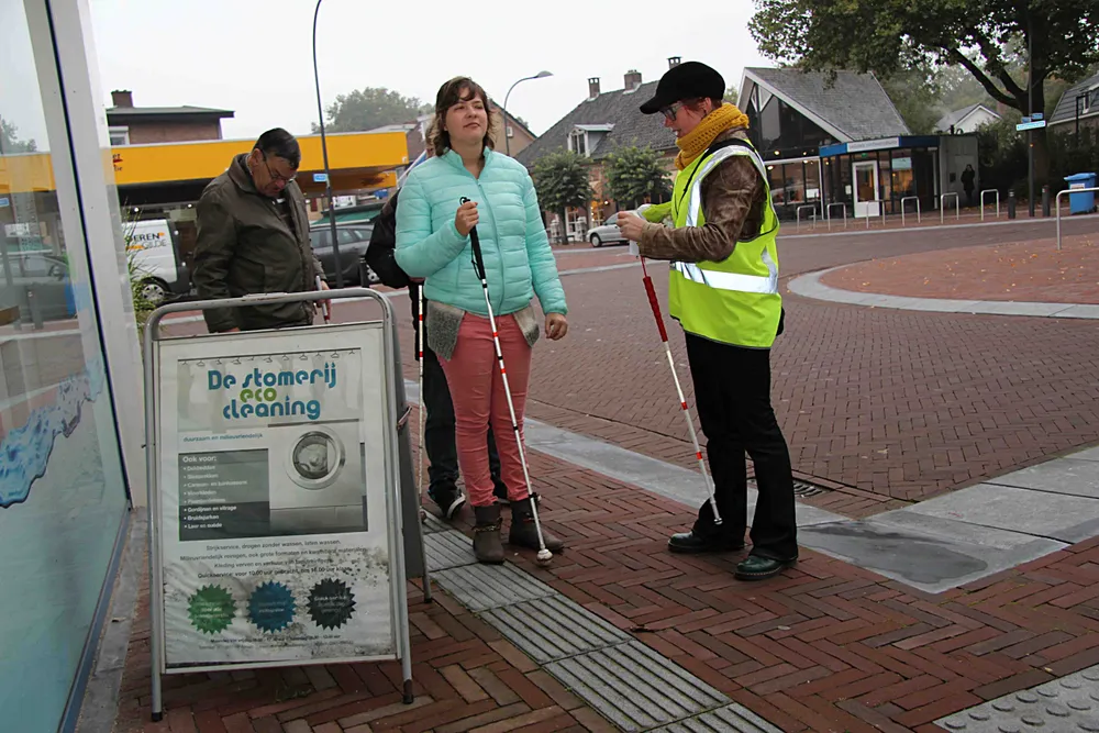 Trainer Alies Kamphorst en visueel beperktenBert Vernooij, Henriette de Weerd en Michel Hardoff voeren vandaag actie in het kader van de de internationale Dag van de Witte Stok. Vanuit dagbestedingslocatie de Drieluik aan de Smutslaan wandelen ze richting het dorp om het belang van de geleidelijn onder de aandacht te brengen. Want nog te vaak belemmeren obstakels als fietsen, scootmobiels tot reclameborden hen om zelfstandig de weg kunnen vinden op straat.