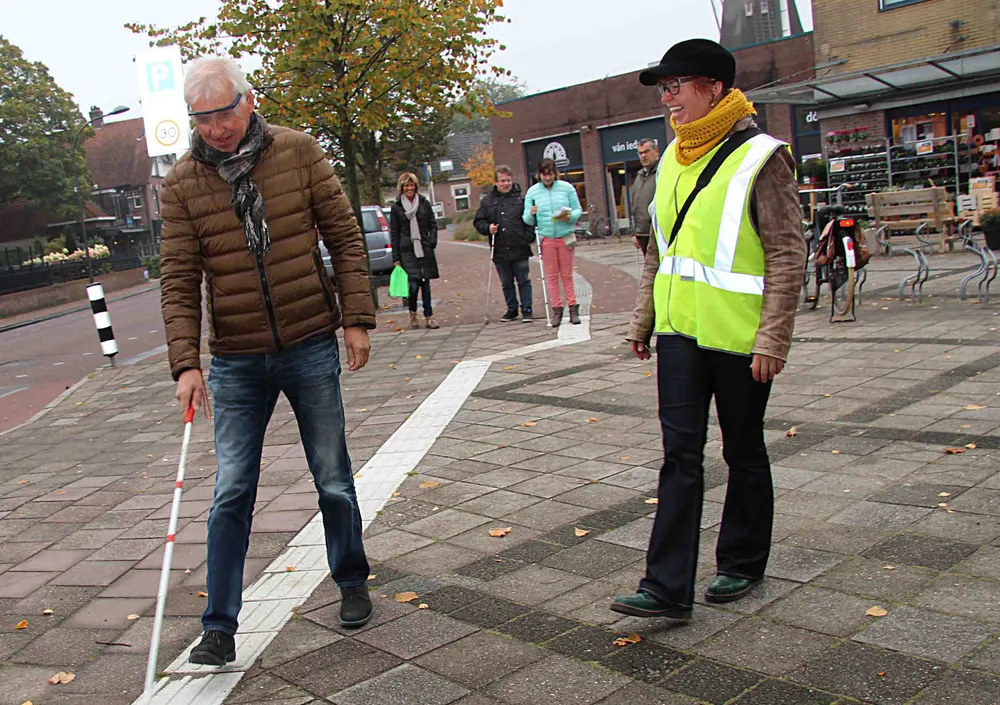 Voorbijgangers worden bovendien uitgenodigdin de huid te kruipen van een visueel beperkte. Jan Garderenbroek die ter hoogte van de Zaak van Ermelo langsloopt durft de uitdaging wel aan. Gewapend met een witte stok en een simulatiebril op probeert hij onder toeziend oog van Alies zijn weg te vinden. Dat valt niet mee. "Wat is dit ingewikkeld zeg, je staat gewoon doodsangsten uit. Want je wereld wordt ineens een stuk kleiner. Ook krijg je echt de neiging om in elkaar te duiken van angst."