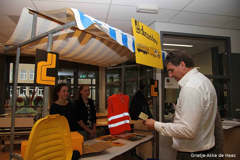 Firma Dusseldorp verdient een opstekerzo vinden Mierthe van Dalen en Romy Pul. Dat straalt hun informatief ingerichte kraam dan ook uit. Ze waren tijdens het bedrijfsbezoek zeer verrast over de bergen afval waarmee Dusseldorp afval dagelijks wordt geconfronteerd, het recycled en daar een boterham mee verdiend. Een beetje van slag raakten ze van het vertoonde filmpje van dieren die slachtoffer waren van achteloos weggegooid zwerfafval. "Je ziet dan dat de dieren worden ontleed en er van stukjes blik tot scheermesjes wordt aangetroffen."