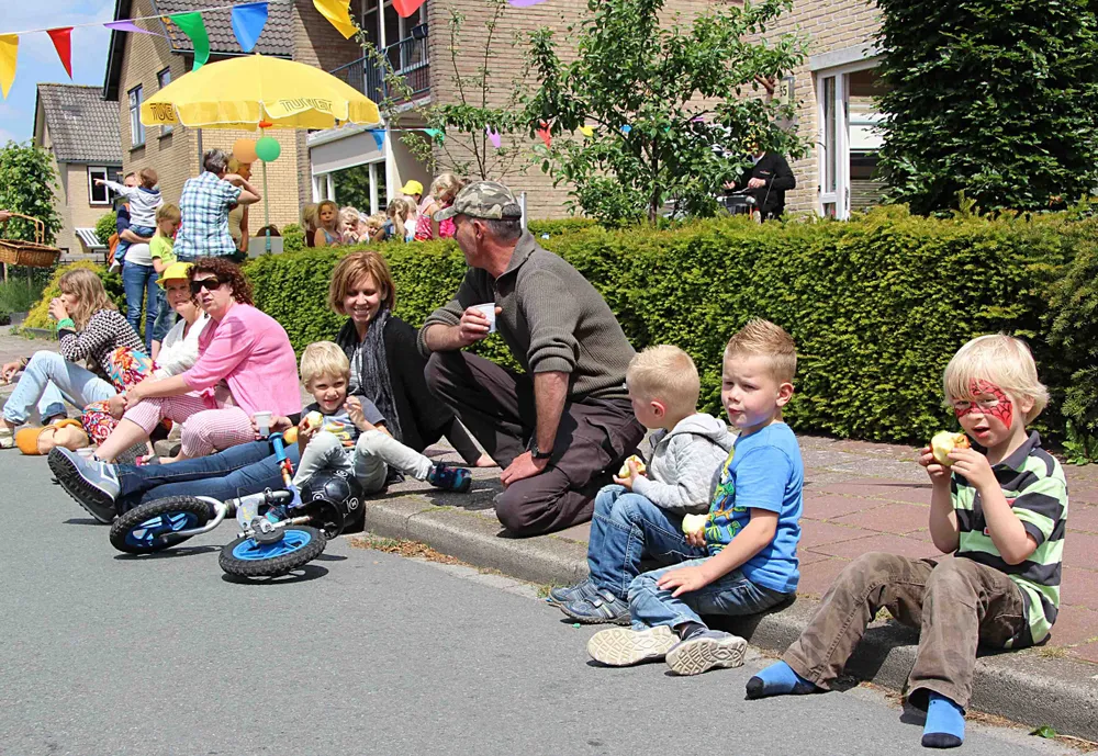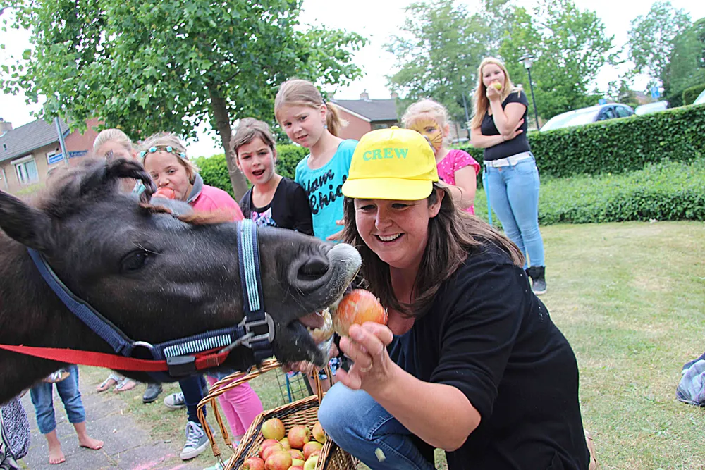 Boer Piet moest dit jaar met zijn veestapel helaas verstek laten gaan.Maar het alternatief was minstens zo leuk. Evelien, een vriendin van de buurt die in het buitengebied van Ermelo woont, had haar twee pony's Tinus en Arabella beschikbaar gesteld, waarop alle kinderen een rondje om het plantsoen mochten maken. Tinus was van het hongerige soort en dook met zijn snuit in de mand met appels van Anita. Die liet hij zich zo goed smaken dat het kwijl in het rond vloog en Anita naar huis moest om zich te verkleden.