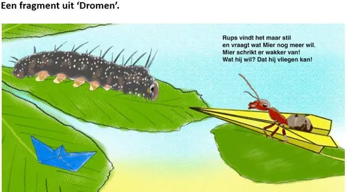 'Dromen’: Als een rups en een mier spelen, rust de mier even uit. Hij heeft spannende dromen. Als de rups eenmaal een vlinder is geworden, komt een droom uit!
