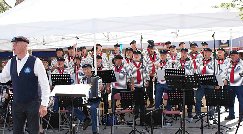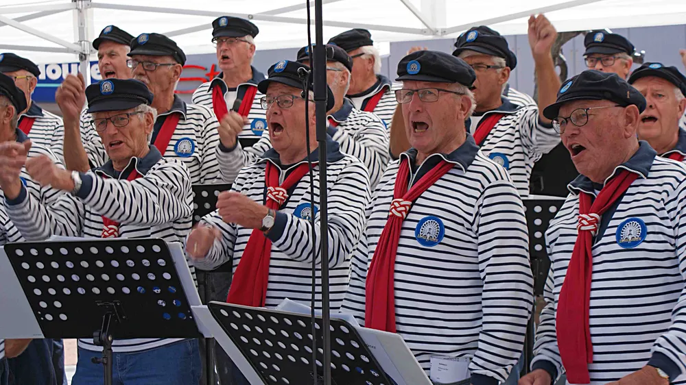 Als gasten heeft Ermeluiden 7 bekende shantykoren uit de regio en uit de rest van Nederland uitgenodigd om het publiek op diverse locaties re vermaken. Zelf treedt de jarige natuurlijk ook op. Zeer gecharmeerd toonde een lid van De Zingende Padd’n uit Wapenveld zich vanmiddag over de dames van de Kokkels en Mokkels uit Harderwijk. "Ze klinken zó lief en zó intiem. Zie je trouwens die ene vrouw? Ze staat steeds naar me te lonken. Maar ik doe het niet hoor", haastte hij zich te zeggen.