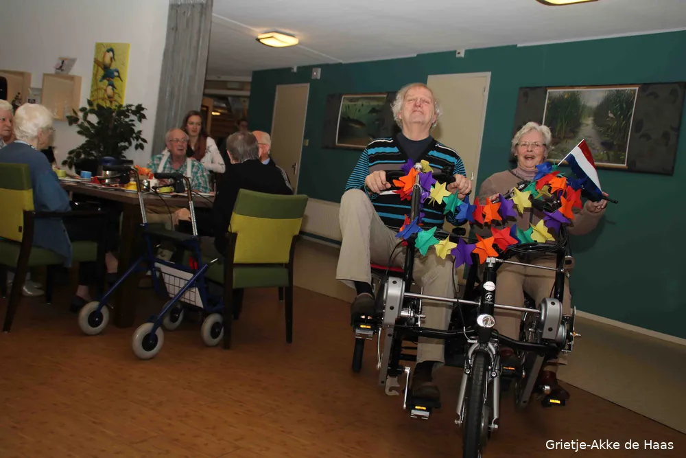 Woonzorgcentrum De IJsvogel aan de IJsbaanweg 37 heeft vanmiddag, woensdag 15 februari, feestelijk de Fun2Go duofiets in gebruik genomen. Gebroederlijk naast elkaar reden cliënt Be Wolfs en Lidy Jacobi van het bestuur van Vrienden van Zorggroep Ermelo, de bont versierde aangepaste fiets de huiskamer binnen.