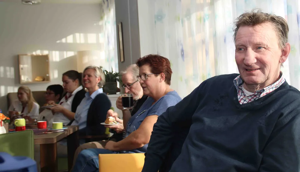 Onder luid applaus natuurlijk van de overige cliënten, verzorgend personeel en andere belangstellenden die de overhandiging met koffie en gebak vierden. Want de duofiets in de vorm van een driewieltandem is uitermate geschikt voor de doelgroep die in de IJsvogel woont en hun begeleiders.