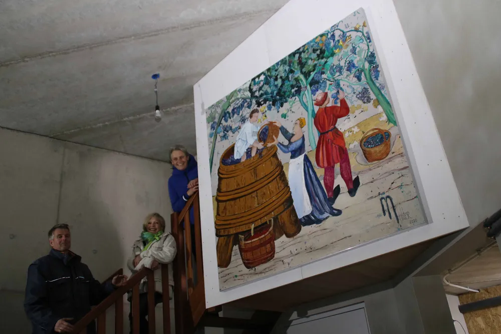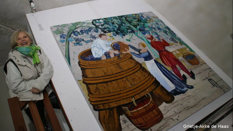 Kunstenaar Inge Mulder (75) uit Ermelo heeft vanmiddag, zaterdag 12 december, het schilderij onthult dat zij heeft gemaakt voor de wijnkelder van Wijngaard Telgt aan de Telgterweg 221. Het schilderij van 1,80 bij 1,80 meter dat een Middeleeuws wijntafereel verbeeldt, viel erg in de smaak bij Jan en Hennie van den Ham, eigenaren van Wijngaard Telgt en tevens opdrachtgevers voor het schilderij.