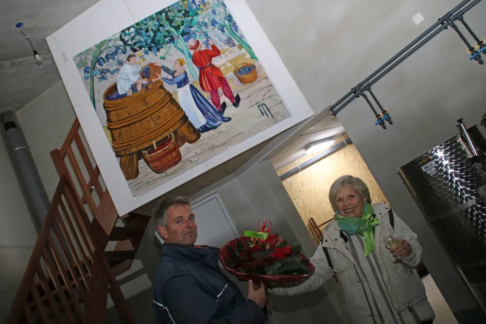 Jan en Hennie kennen Inge omdat ze sinds ongeveer een jaar vrijwilliger is bij Wijngaard Telgt. Ze maakten kennis met haar kunstwerken tijdens de dit jaar gehouden Kunstroute. Jan: "Zo is eigenlijk het balletje voor dit schilderij gaan rollen. Want ik vond haar schilderijen mooi, kleurrijk en gedurfd, die stijl zou hier mooi in de wijnkelder passen."