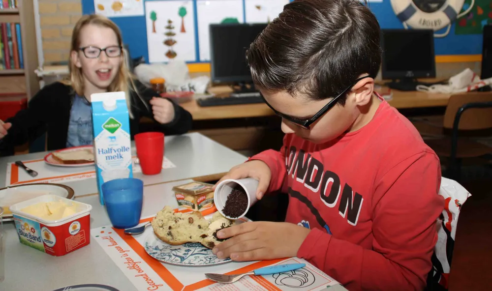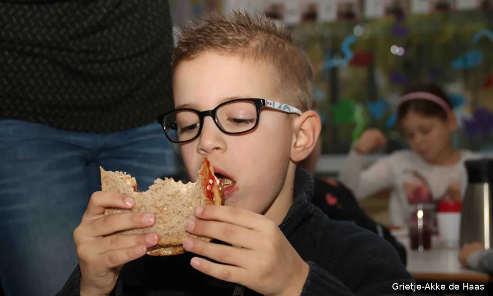 Een bruine boterham met daarop boter, kaas, jam, hagelslag en appelstroop; David van groep 3 van de Julianaschool moest zijn mond wel heel ver opensperren om zijn smakelijke ontbijt te verorberen.
