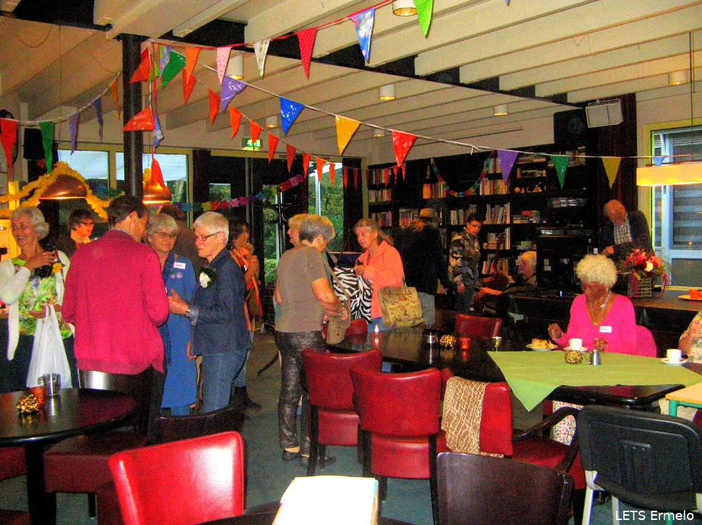 De deur van Pinel aan het Raadhuisplein in Ermelo staat wijd open. Zo’n veertig leden van LETS Ermelo, de plaatselijke ruilkring, vieren samen met belangstellenden een klein feestje ter ere van het 15-jarig bestaan. LETS is de afkorting van Lokaal Economisch Transactie Systeem, een plaatselijk netwerk van mensen die elkaar helpen in ruil voor een wederdienst. De Ermelose ruilkring is een van de ongeveer honderd kringen in Nederland.