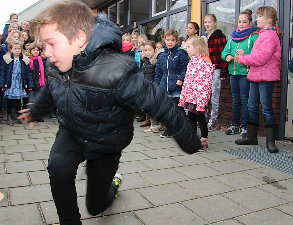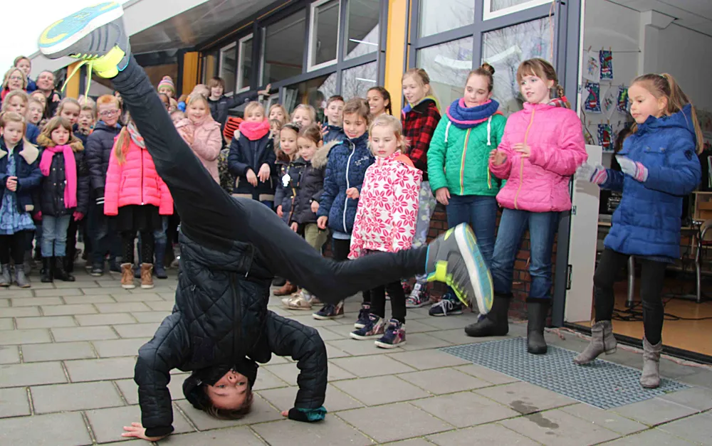 De aftrap vond vanmiddag plaats, donderdag 21 januari, op het schoolplein. Meerdere kinderen van diverse groepen met danstalent hadden een dansje ingestudeerd en leerden deze aan de andere leerlingen van de Margrietschool. Wat een groot succes bleek. In de eerste plaats oogsten de danstalenten veel bewondering en applaus, wat ze deed groeien van trots. Ervaren echter dat van groot, klein, ouders tot leerkrachten maar wat graag mee dansten was minstens zo'n grote beloning voor hun inspanningen. Super danstalent Ken van Heuvelen trakteerde het uitzinnige publiek op een solo-optreden, compleet met acrobatische toeren. "Dansen heb ik van mijn vader geleerd", vertelde de jongen uit groep 6.