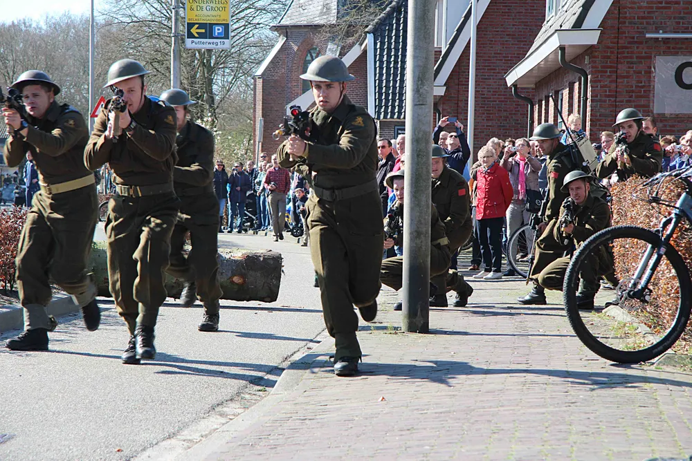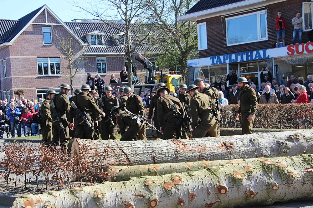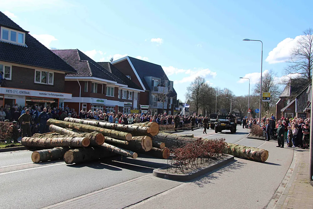 Het werd ze niet bepaald gemakkelijk gemaakt. De militaire voertuigen stuitten namelijk op een wegversperring van jewelste ter hoogte van Fiets Centraal aan de Putterweg. Of hadden de verantwoordelijken met de meeste voorpret de dikste boomstammen uit het bos gehaald. Zodra de geweersalvo's van de oprukkende militairen waren verstomd en de bezetter op de vlucht sloeg, werd met man en macht én vertoon van veel militair materieel gepoogd de boomstammen te verwijderen.