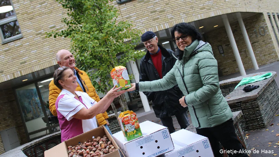 Vandaag, zaterdag 24 oktober, hebben leden van Rotary Ermelo 2500 tulpenbollen verpakt in dozen bezorgd bij woonzorgcentrum Kroondomein. De dozen werden overhandigd aan Ton en Elly de Kruijf van de Zorggroep Noordwest-Veluwe. Als de tulpenbollen vlot worden gepoot kunnen de bewoners en passanten volgend voorjaar genieten van een zee aan bloemen.