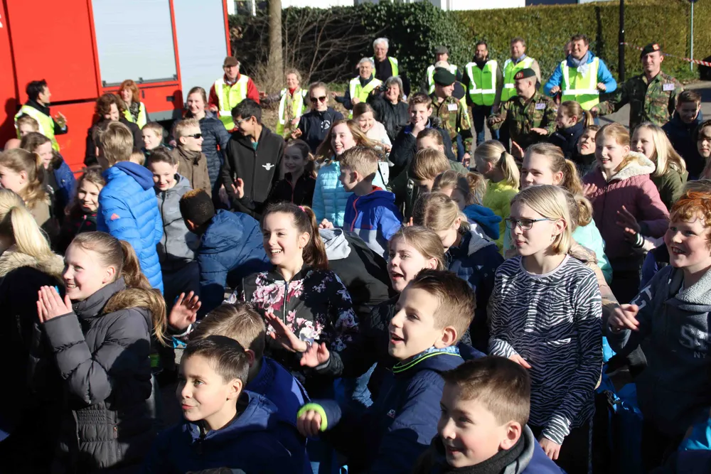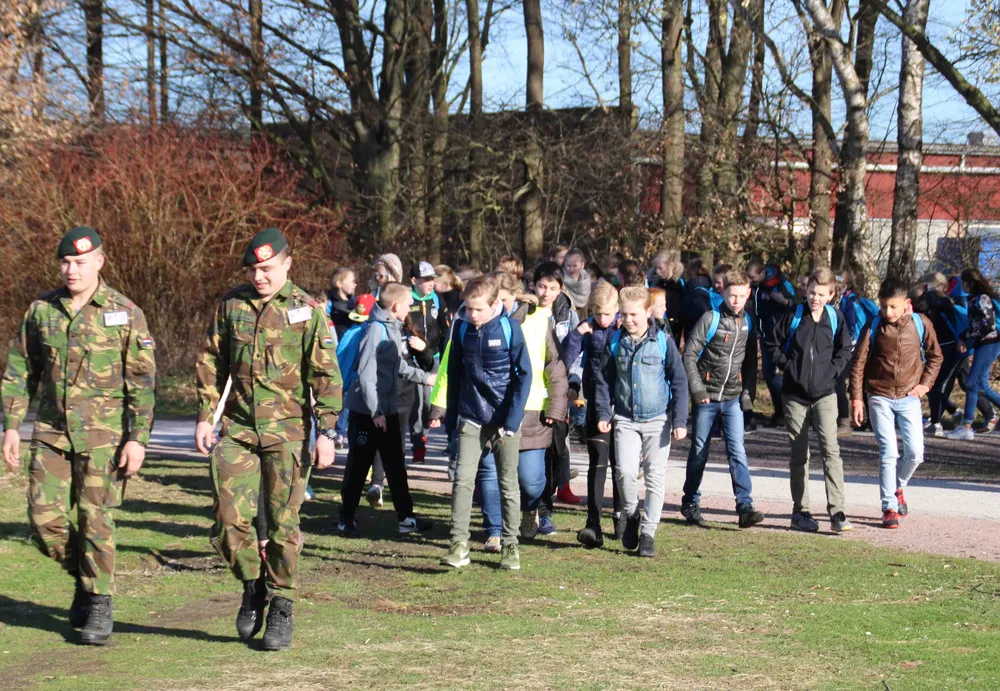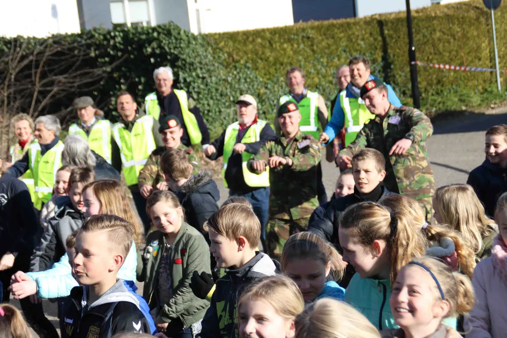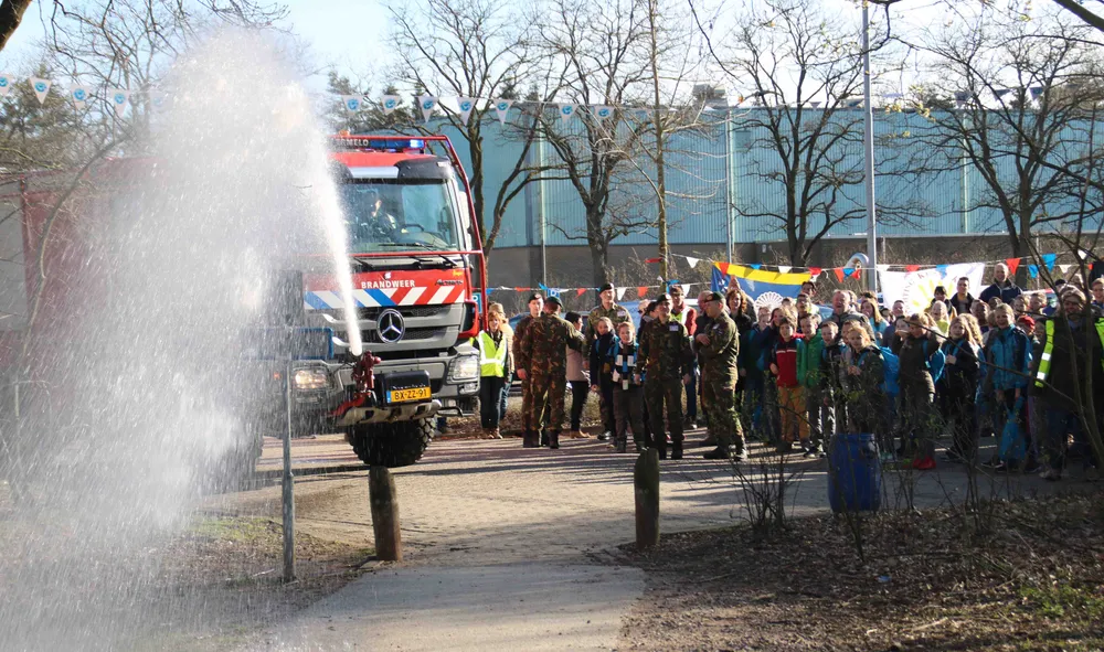 De tweehonderd leerlingen die zich verzamelden op de parkeerplaats van zwembad Calluna, boften met het stralende weer. "Zes kilometer wandelen met zes liter water op de rug is immers al zwaar genoeg", merkte een lid van de Rotaryclub op, "als ze dan ook nog in het water hadden moeten lopen... ." Wim Themmen heette de leerlingen en de leerkrachten van harte welkom namens de Rotaryclub, als ook de Ermelose Brandweer als dé waterspecialisten, de militairen van de KNHS in Ermelo en Sportinstituut Ermelo die de warming-up verzorgde.