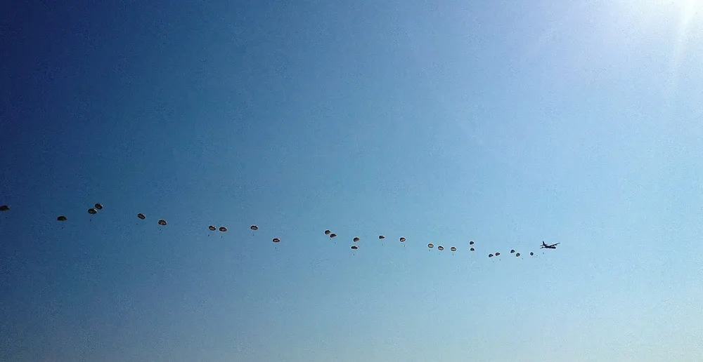 Als witte engelen zweefden vandaag, woensdag 14 september, de parachutisten tegen de blauwe hemel, terwijl de oude Hercules grommend in de verte verdween.