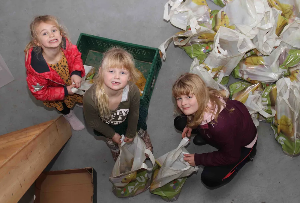 Ook de kinderen van de vrijwilligers helpen een handje mee om de tassen te vullen. Daarnaast maken ze kerstkaarten om in elke boodschappentas te doen. Tegen etenstijd vanavond staat de vrijwilligers een hele lekker warme hap te wachten: patat met frikandellen, gesponsord door Cafetaria-Eetsalon Pinokkio uit Ermelo.