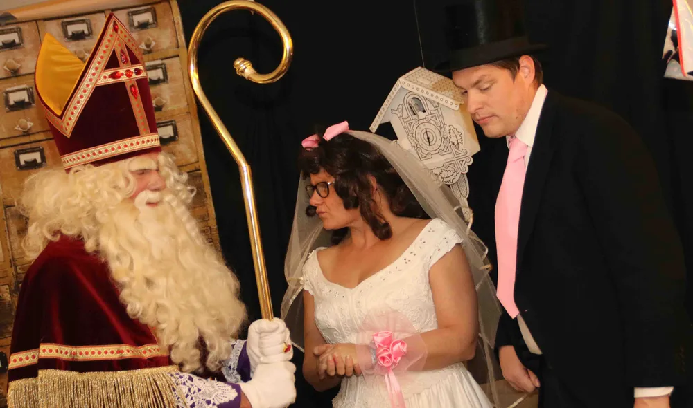 Wat hebben Sinterklaas als trouwambtenaar, een grote pot pindakaas, een molen, een paar muizen, een sikkeneurige directeur en een reuze strik met elkaar te maken?