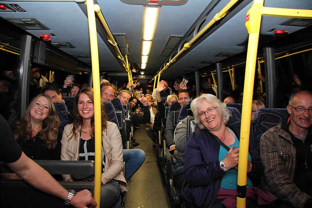 Echte kroegtijgers stapten op één van de twee passagiersbussendie het publiek van kroegje naar kroegje reed. Wat nog een hele onderneming was voor de ervaren buschauffeurs. Een ritje dwars door de Stationsstraat duurde zo 20 minuten omdat de doorgang werd versperd door fout geparkeerde fietsen of auto's.