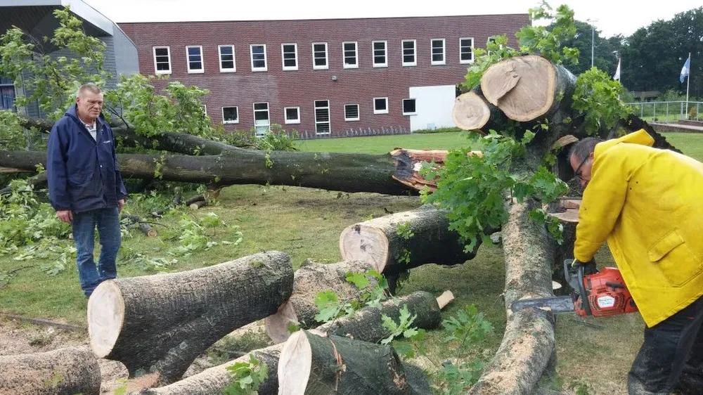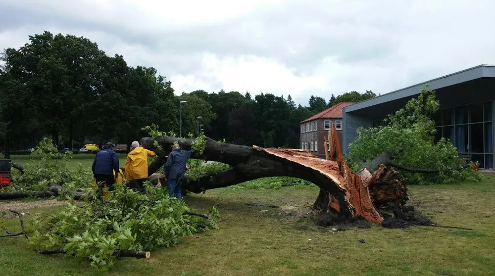 Omstanders en een personeelslid spreken van geluk omdat de forse boom in zijn val alleen de dakrand van bedrijfsrestaurant Bon Appétit van Proson beschadigde. Helemaal te kijken staan ze niet dat de eik is bezweken onder het geweld van de storm. De stam was namelijk aangetast door zwammen. Ook de schade op het terras valt mee. De kwaliteit van de picknicksets is zodanig dat ze een stootje kunnen hebben, zo blijkt.