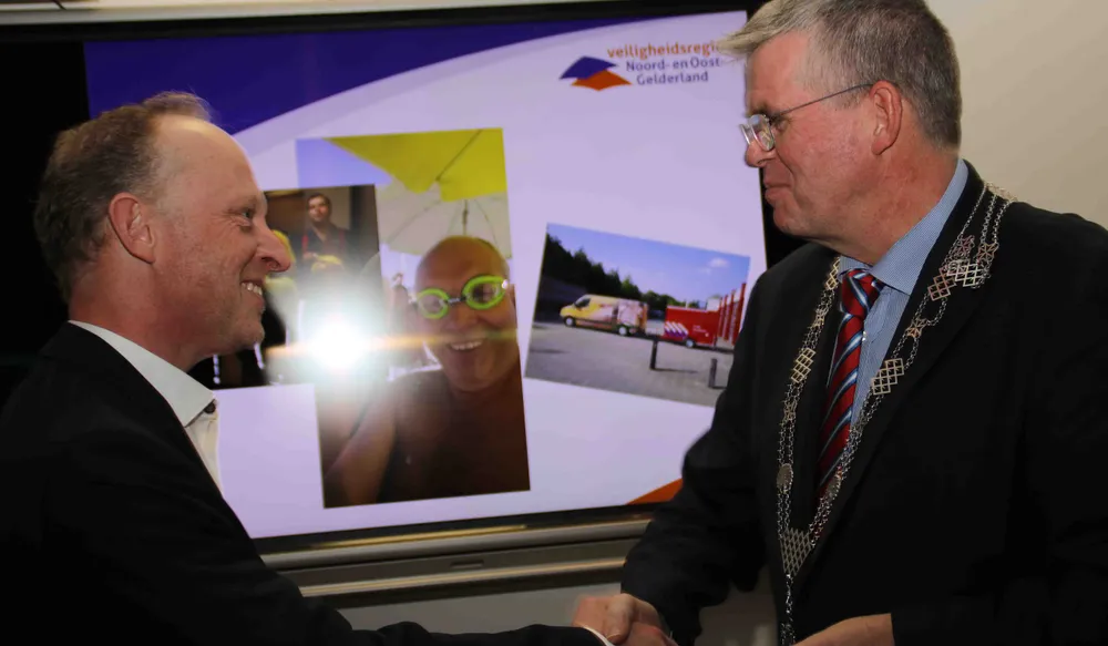 Henk van Berg nam tevens afscheid van de vrijwillige brandweer. Hij is 20 jaar actief geweest voor de Brandweer Ermelo. Baars typeerde Van den Berg als een goede brandweerman die altijd bereid was om waar dan ook te helpen.