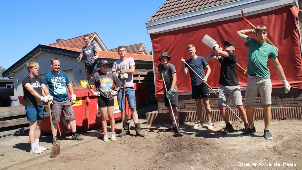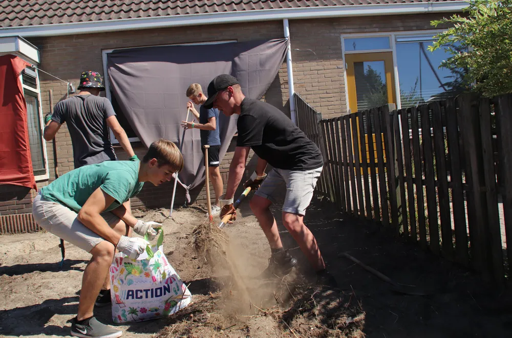 Er kwam geen graafmachientje aan te pas. Onvermoeibaar schepten ze de tuinaarde in de boodschappentassen, om ze vervolgens te legen in de container op de oprit. Twee jongens maakten er zelfs een sportieve workout van, compleet met diepe kniebuigingen en de opzwepende kreten die hierbij horen. Zweten zag je ze overvloedig, maar er kwam geen klacht over hun lippen.