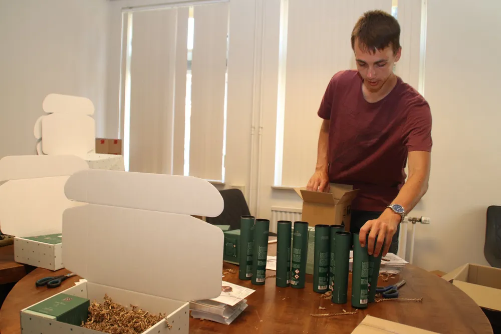 aan Hanengewei in Ermelo. Het was weliswaar een minder warme klus, maar aanpoten was het zeker voor de tieners. Via de firma Ducky Dons uit Ermelo had Materra een mooie opdracht gekregen, namelijk het inpakken van diverse Rituals artikelen in een geschenkdoos. Deze wordt via Ducky Dons de klant namelijk cadeau gedaan bij een bepaalde actie.