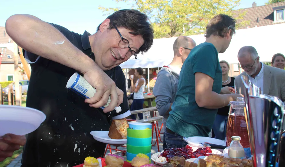 Klappe opende met een gang van de glijbaan niet alleen de speeltuin. Zijn bezoek stond ook in het teken van De Leukste Straat van Ermelo, de jaarlijks gehouden verkiezing tijdens Burendag. Kolevaarserf heeft de prijs als eens gewonnen, en natuurlijk deden ze opnieuw een gooi naar de eer. Met onder meer de taartbakwedstrijd probeerde de buurt de jury te paaien. Die lieten zich de stukken taart goed smaken.