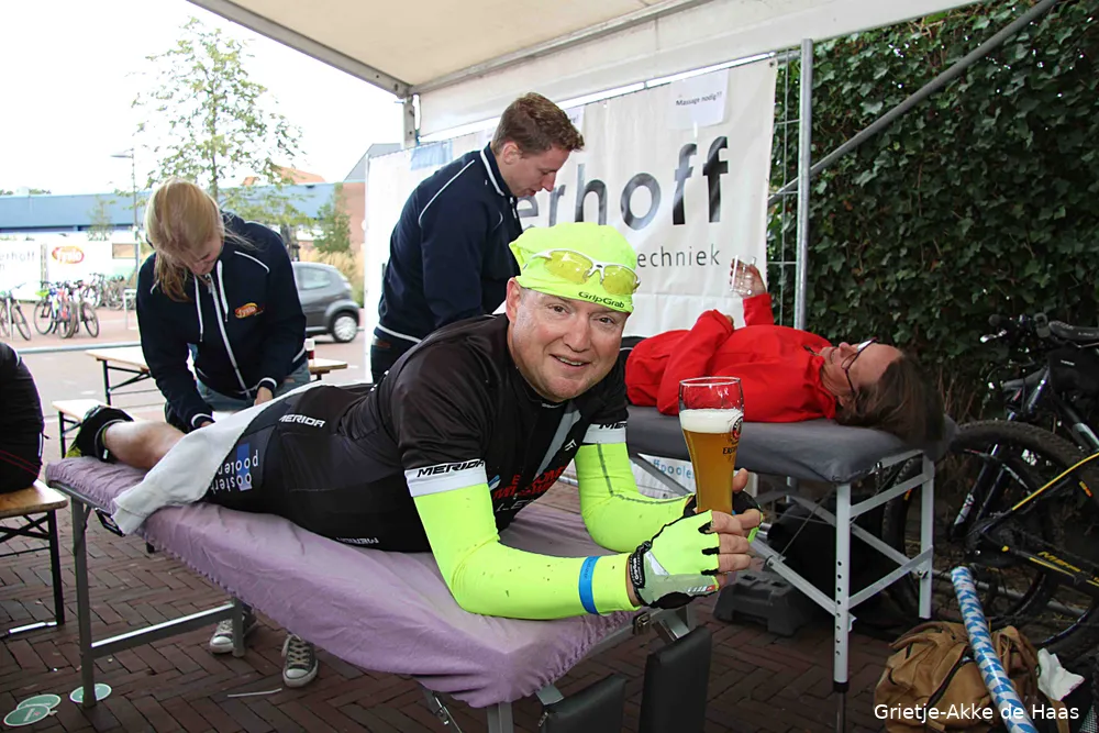 Erwin Baars liet zich eerst op de massagetafelonder handen nemen door Ronald en Marilyn van Fysio Ermelo Prins en Staal. "Als 30-kilometerroute-groep startten we als laatste", pochte hij, "en we zijn als eerste gefinisht." De medewerking van Fysio Ermelo was overigens belangeloos zodat de 5 euro per massagebeurt bestemd kan worden voor het goede doel; Molen de Koe, Ermelo's trots.