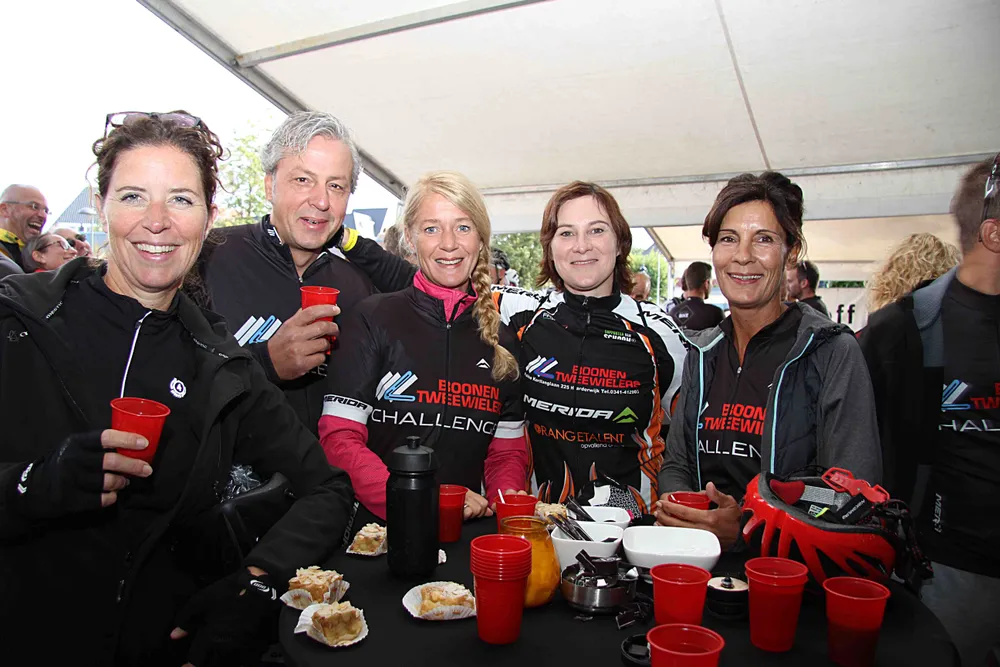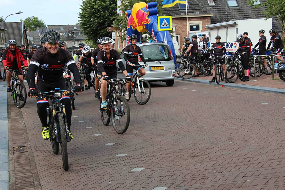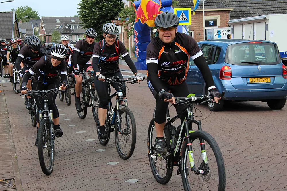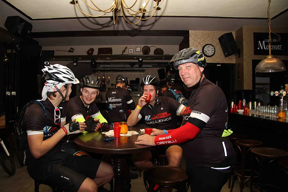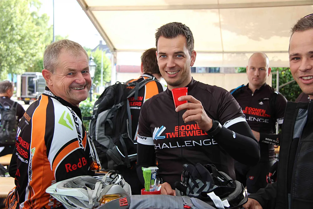Henrie Hop die zich voor de startsamen met zijn zoon Erik en Wouter Pieper de koffie met appelgebak goed laat smaken, noemde de weersomstandigheden perfect voor de mountainbike-tourtocht. Het zal een flinke dobber worden zei hij te verwachten. "Ik heb de route van de week gereden met de Boonen-jongens. Wat erg goed ging. Maar daarna heeft het weer 2 dagen geregend, dus makkelijker is het er zeker niet op geworden", grijnsde hij veelbetekenend.