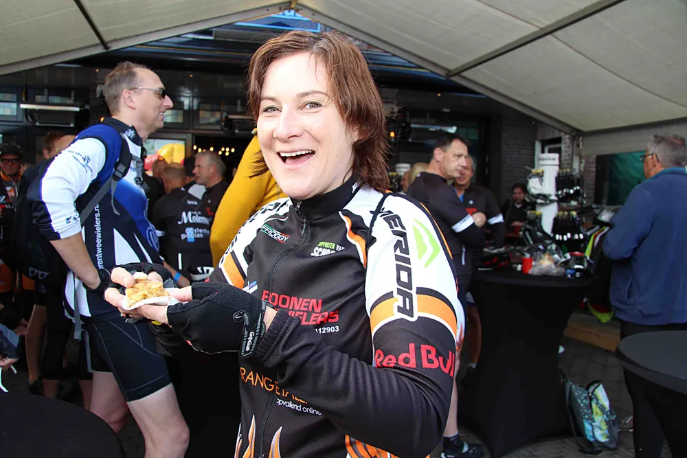 Maar liefst iets minder dan de helft van de deelnemers zijn vrouwen.Karin Hoogendoorn, de zangeres van de inmiddels beroemde Ermelose band Keef: "Ik mountainbike nog maar een maand of vier en doe mee aan de 30 kilometerroute. Dat moet te doen zijn, want normaal redden we op zondag zo'n afstand ook."