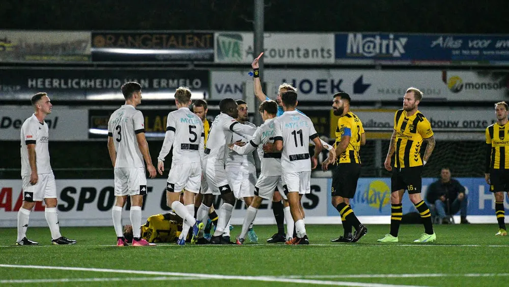 De ploeg uit Hendrik Ido Ambacht liep vlak voor rust nog meer averij op. Wout Neelen, die eerder al een gele kaart had gekregen voor commentaar, raakte met een gestrekt been Omar el Ghazouani en kon na een tweede gele kaart met rood vertrekken.