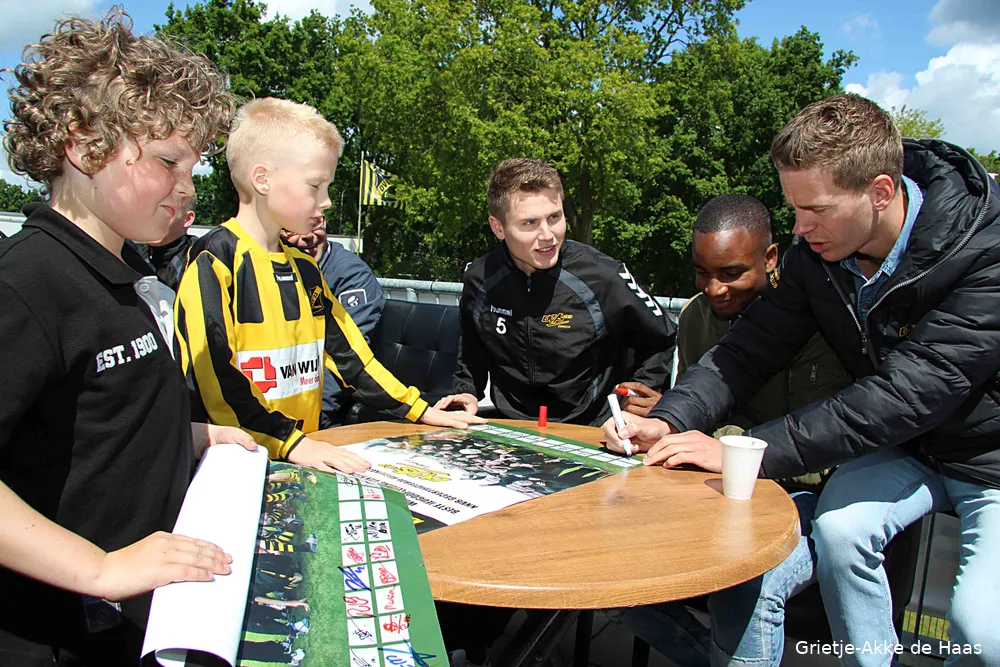 Voor een krabbel van verdedigers Stevan de Geijteren Roald de Vries, middenvelder Jorran van Santen tot aanvaller Michael Musa, geduldig stond de DVS'33-jeugd in de rij tot ze alle handtekeningen hadden verzameld. Zo trots als een pauw renden ze naar hun ouders toe die er vervolgens maar voor moesten zorgen dat hun idolen op papier netjes thuiskwamen. Opgerold en wel wisten die er wel raad mee.