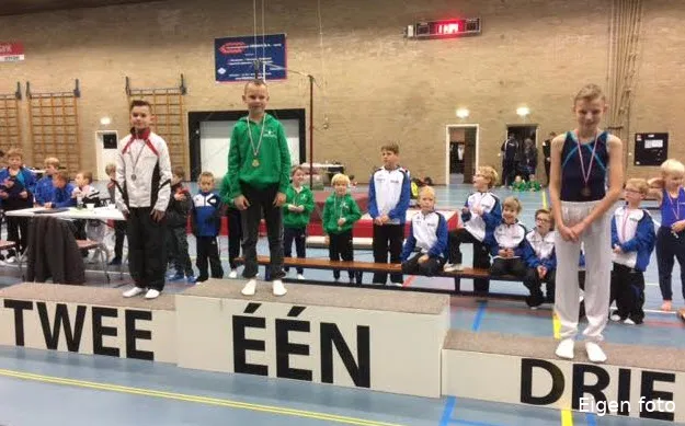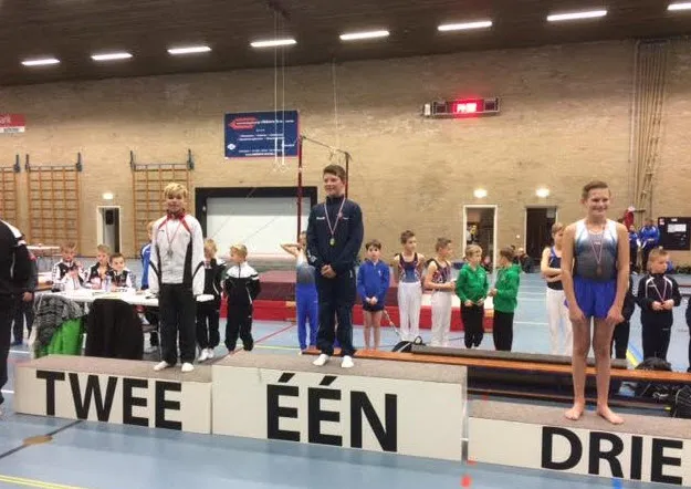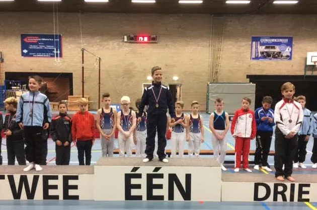 In dezelfde wedstrijd maakte Tom dezelfde stap als Ken door 2 niveaus hoger te turnen dit seizoen. Tom begon erg sterk op het toestel brug en pakte hier direct de eerste plaats. Ook op voltige liet hij progressie zien met meer moeilijkheid en behaalde hier de 3e plaats. Tom werd in de meerkamp heel knap en verrassend 3e en kreeg hij de bronzen medaille omgehangen.