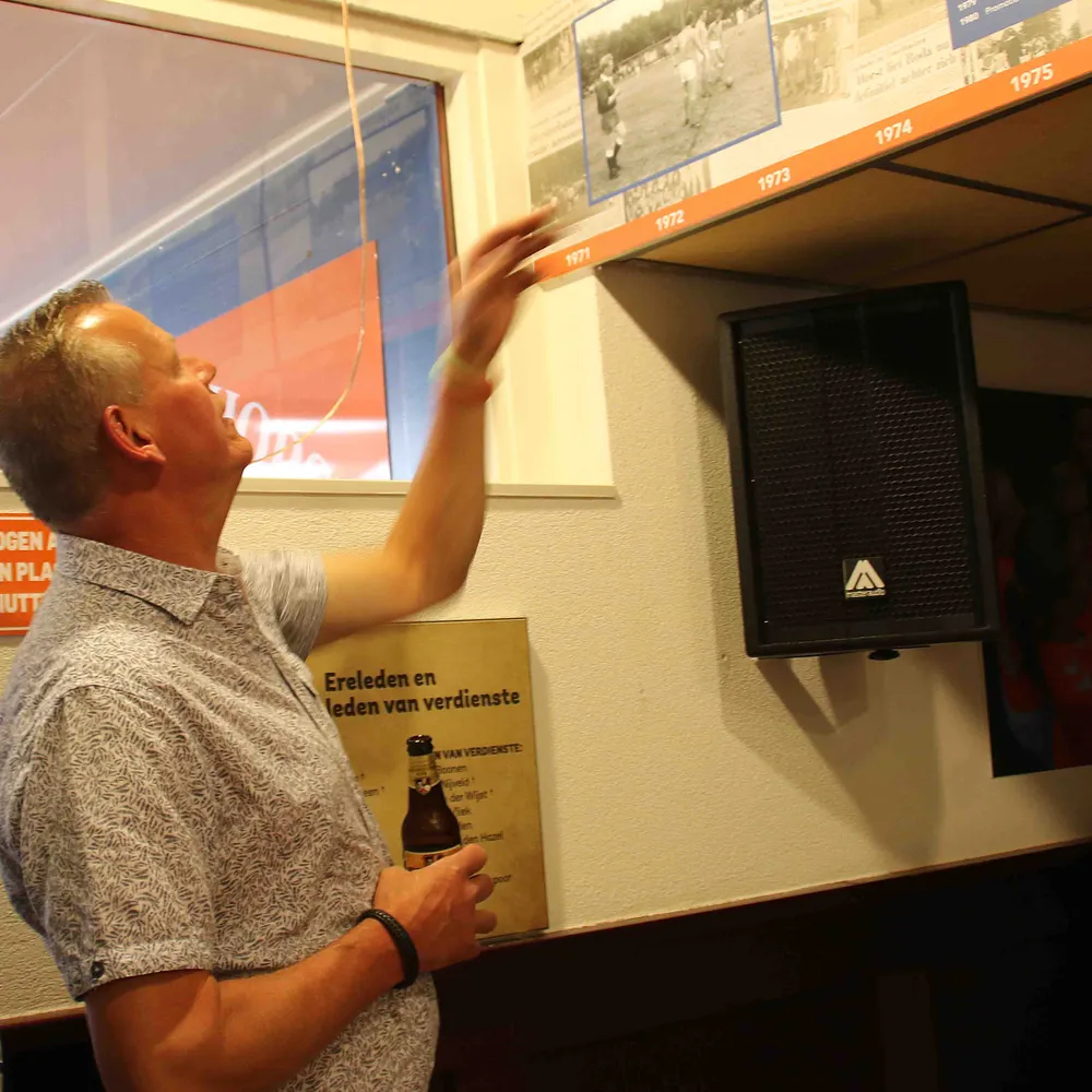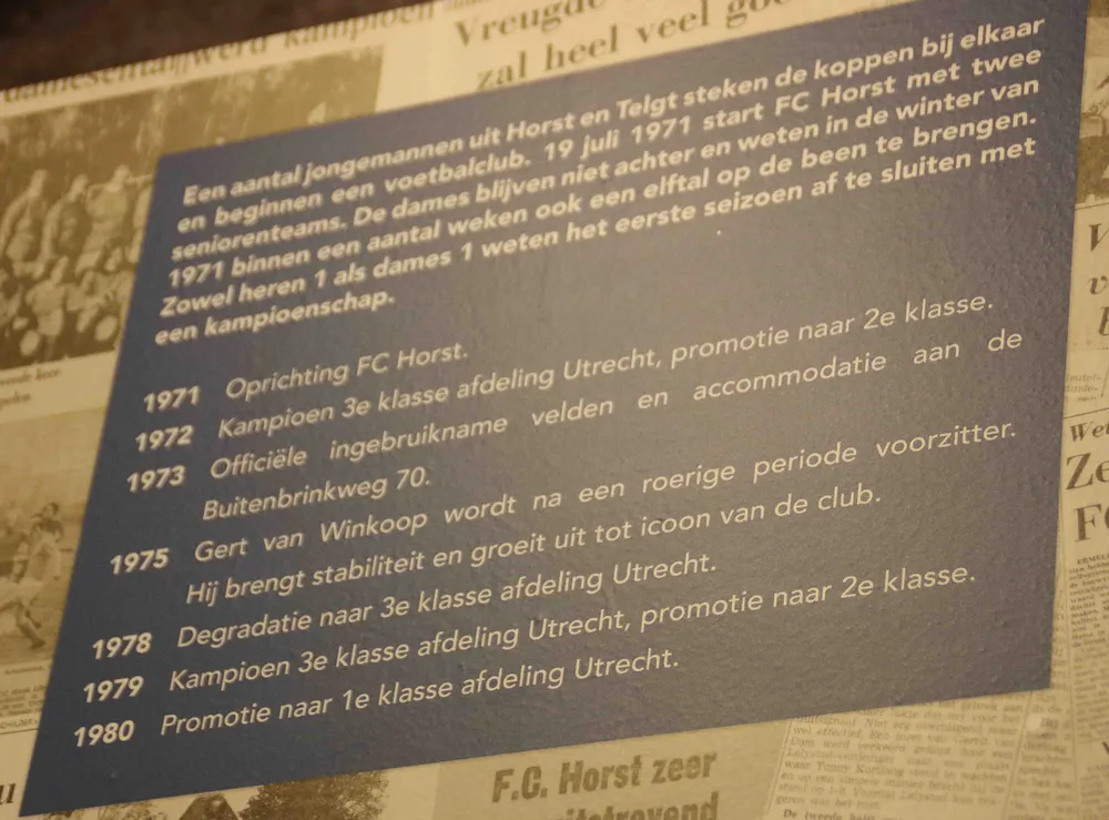 Ook Evert Renden was onder de indruk van de inzet van Aalt Hijmissen. Hij wees naar een foto van Gert van Winkoop die prominent de tijdlijn siert. Een man die als voorzitter heel belangrijk is geweest voor FC Horst. "Hij kwam hier bij wijze van als 'snotneus' binnen, en is maar liefst 26 jaar voorzitter geweest van FC Horst. Zelf ben ik in zijn tijd 22 jaar vicevoorzitter geweest."