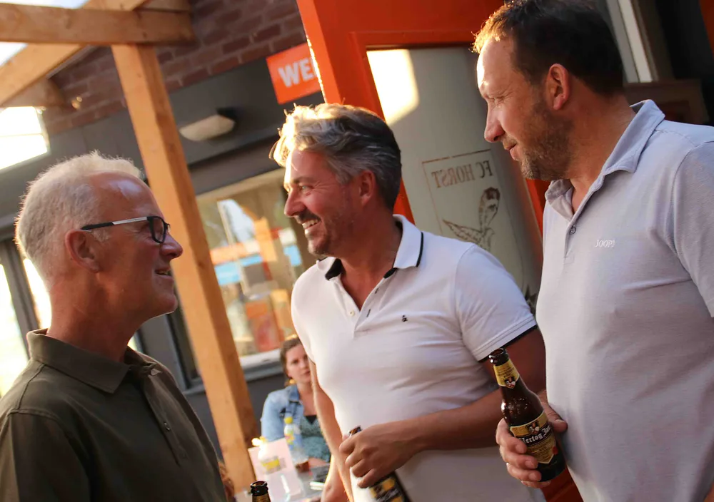 Ofwel een feestje, want door corona mocht het gouden jubileum niet grootschalig worden gevierd. Door de intieme setting echter en het mooie weer was het evenzogoed erg gezellig. Te meer door een chronologisch overzicht van de geschiedenis van 50 jaar FC Horst, een huzarenstukje van Aalt Hijmissen die dit had verbeeld met fotobehang aan de wand van krantenknipsels tot elftalfoto's, en van de eerste voetbalschoen tot voetbaltas.
