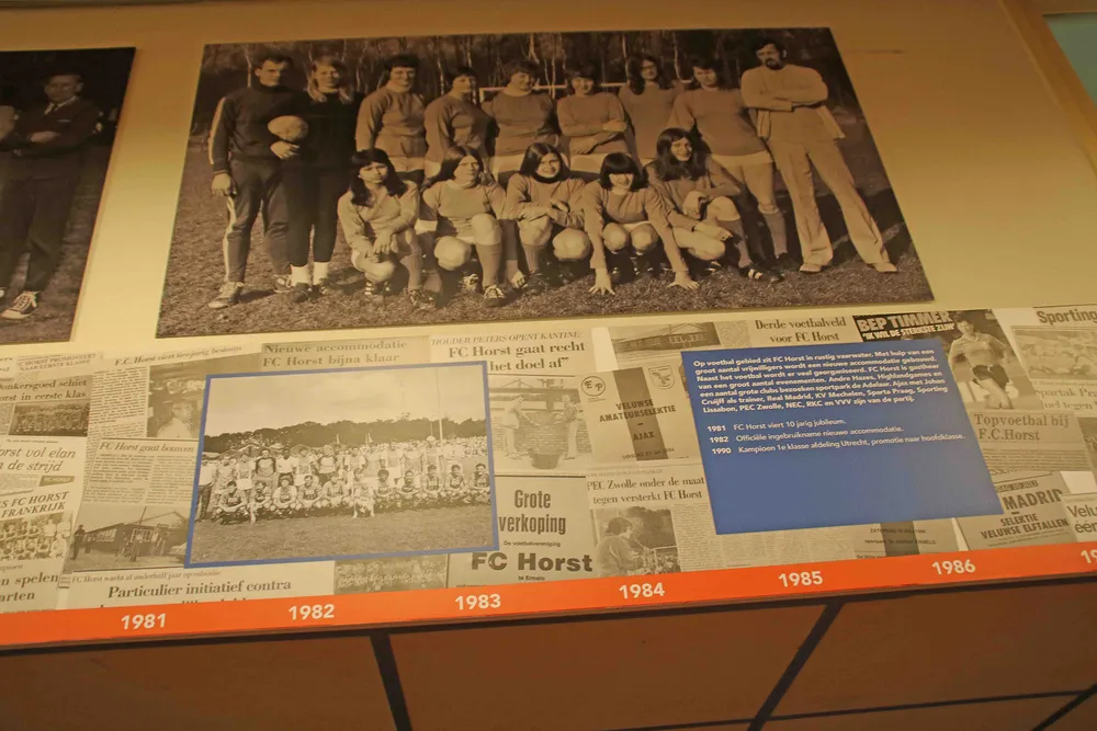 En juist die tijdlijn zorgde voor de meest prachtige verhalen uit de oude doos. Zo verhaalde Jannie over haar tijd dat zij deel uitmaakte van het eerste dameselftal dat bij FC Horst werd opgericht in 1971. Ook het 'staart en schop' verhaal. Bovendien heeft ze er tot op de dag van vandaag nog schik van dat het dameselftal dat een half jaar later werd opgericht dan het mannenelftal, toch nog eerder kampioen werd. "Een dameselftal was bovendien uniek in die tijd, ons elftal had dan ook veel mannelijke supporters."