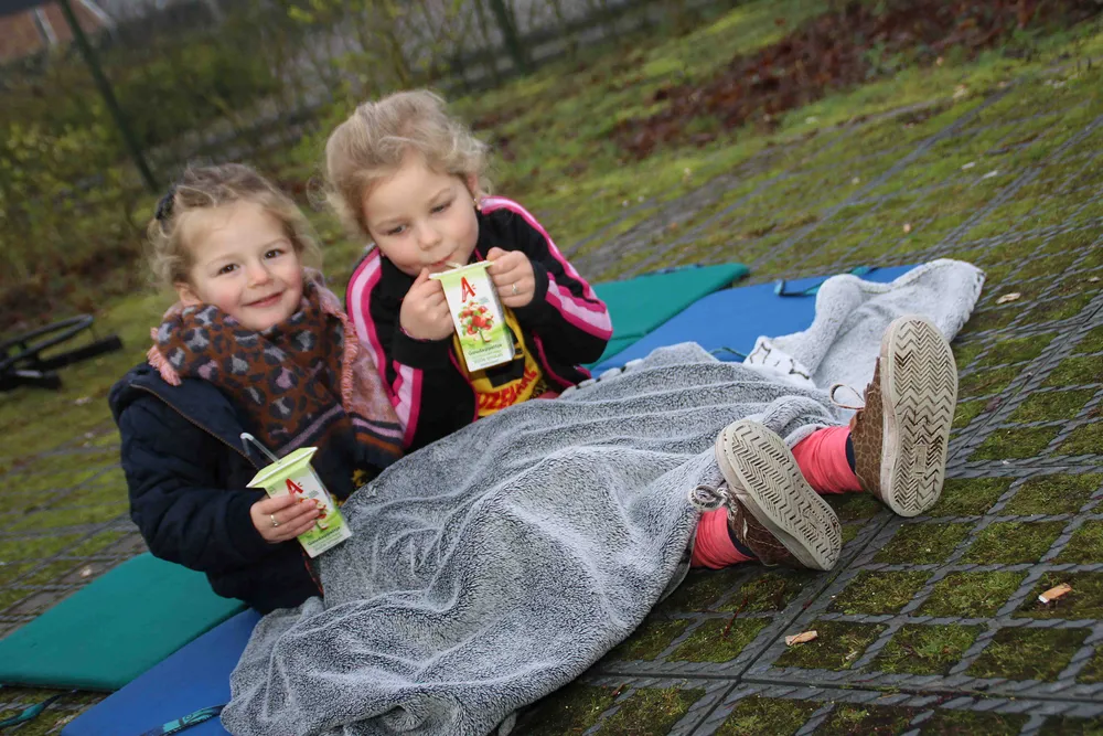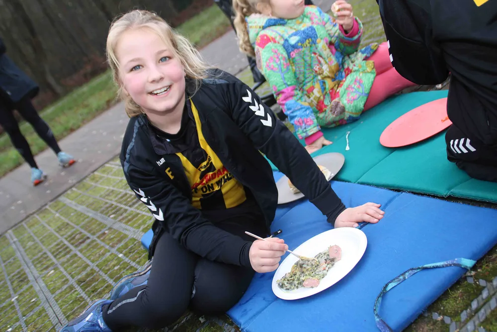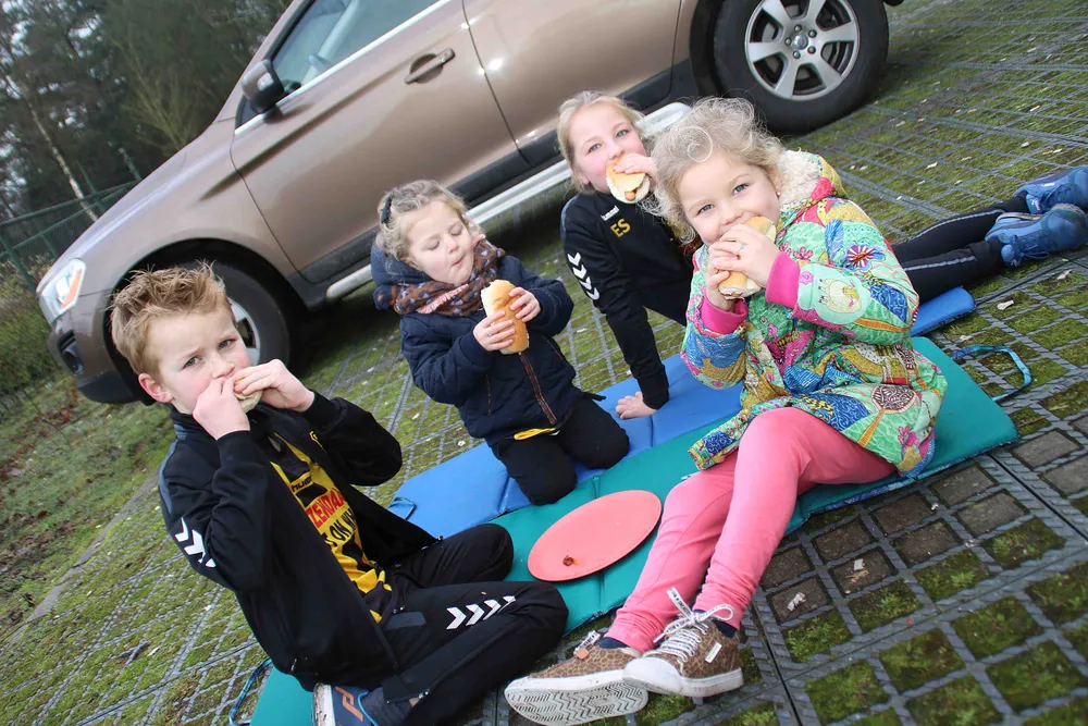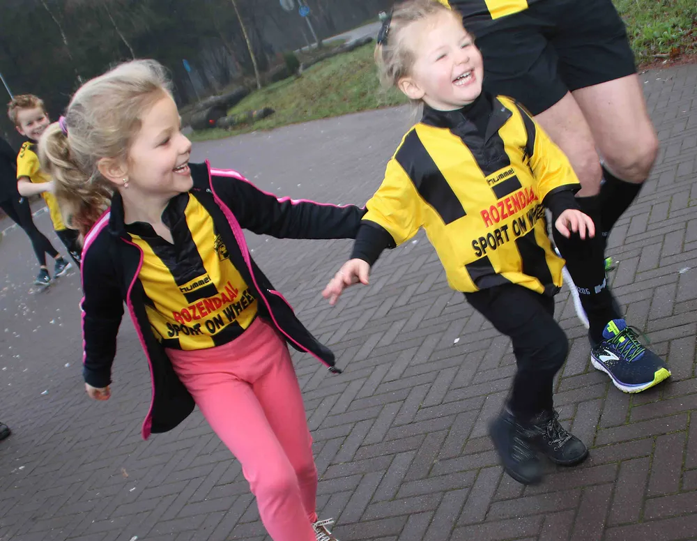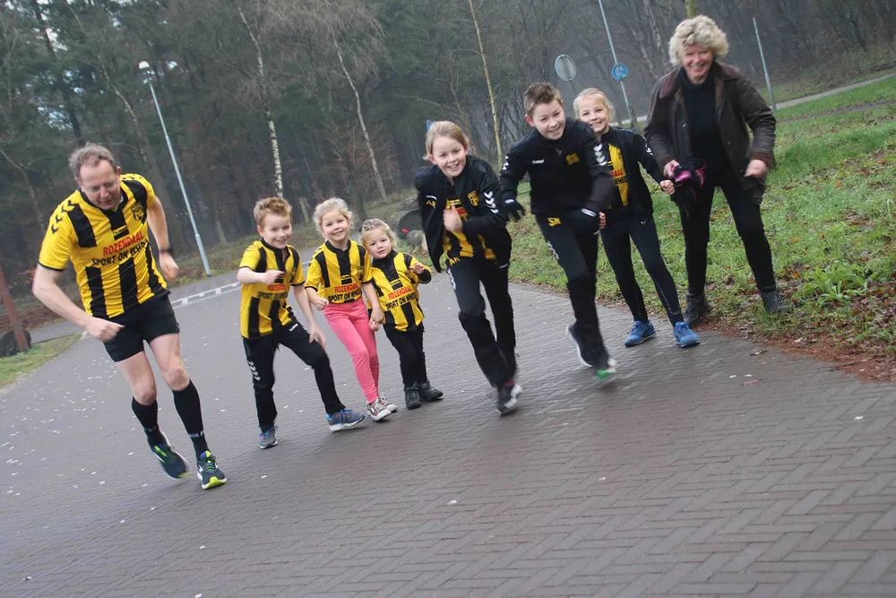 Dat waren Samuel (13), Annemijn (11), Escha (8), Boaz (7), Magali (5), Liselotte (2) en Floris. De laatstgenoemde deed voor spek en bonen mee, want deze kleinzoon is nog maar een paar maanden oud. Hij volgde de hardloopactiviteiten lekker warm ingestopt vanuit zijn wandelwagen.