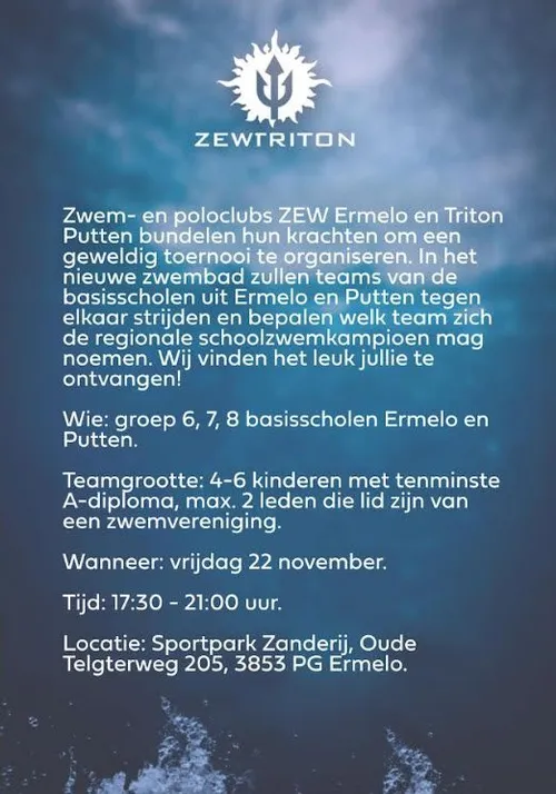Op vrijdagavond 22 november van 17:30 - 21:00 uur zal het tweede schoolzwemkampioenschap voor de groepen 6, 7 en 8 van Ermelo en Putten plaatsvinden. Dit evenement wordt georganiseerd door de zwemverenigingen ZEW Ermelo en Triton Putten. Het schoolzwemkampioenschap zal in het zwembad de Zanderij in Ermelo worden gehouden.