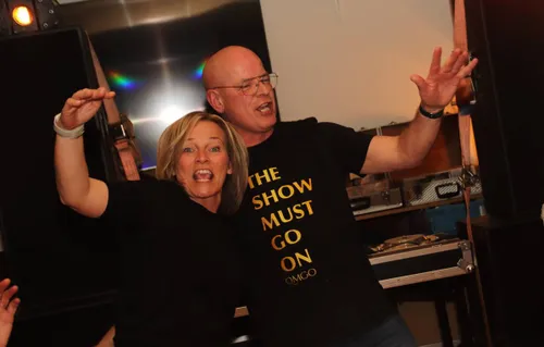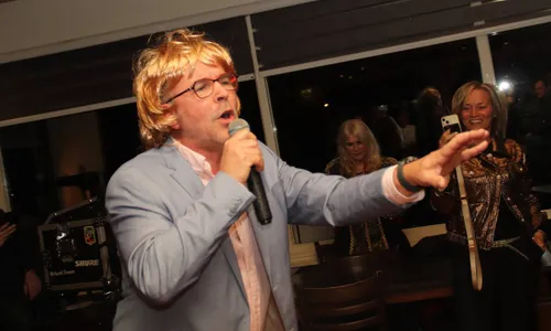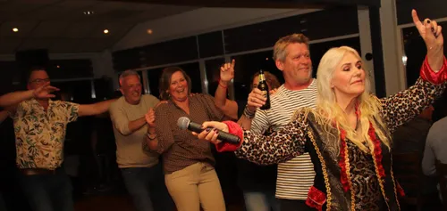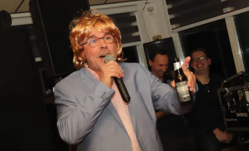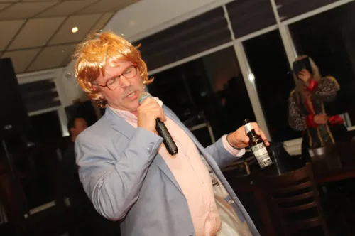 Waar de feestavond wat aarzelend begon, -gezellig bijkletsen met zijn allen met een potje bier erbij is immers ook erg belangrijk-, maakte Martin Morero korte metten met het gekwebbel van de gasten. Hij kweelde luidruchtig zijn grootste hits in de microfoon, wat op de lachspieren van het publiek werkte, net als het ritmische gedraai van zijn achterwerk.