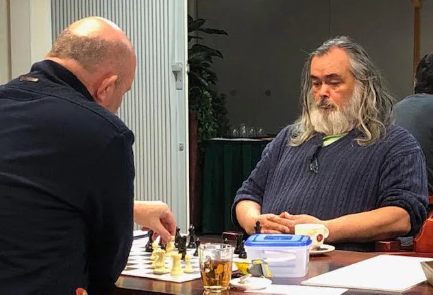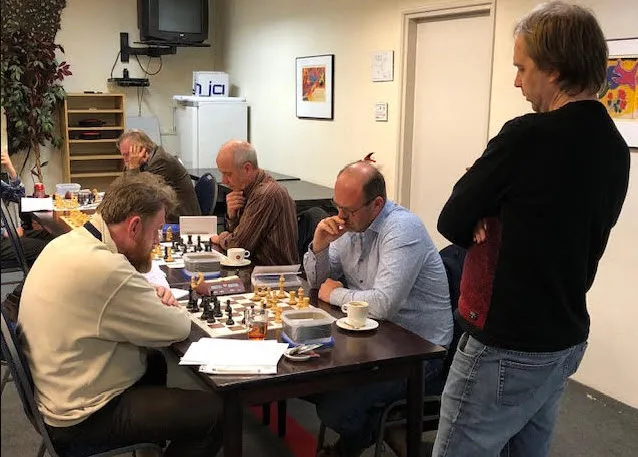 De stand in de kampioensgroep: 1. Hiemstra en Westra, 1,5 punt. 3. Mark de Graaf, Jan Lambrechts en Gerard de Hoop, 1 punt. 6. Bas West, 0 punten.