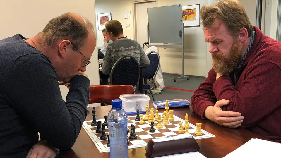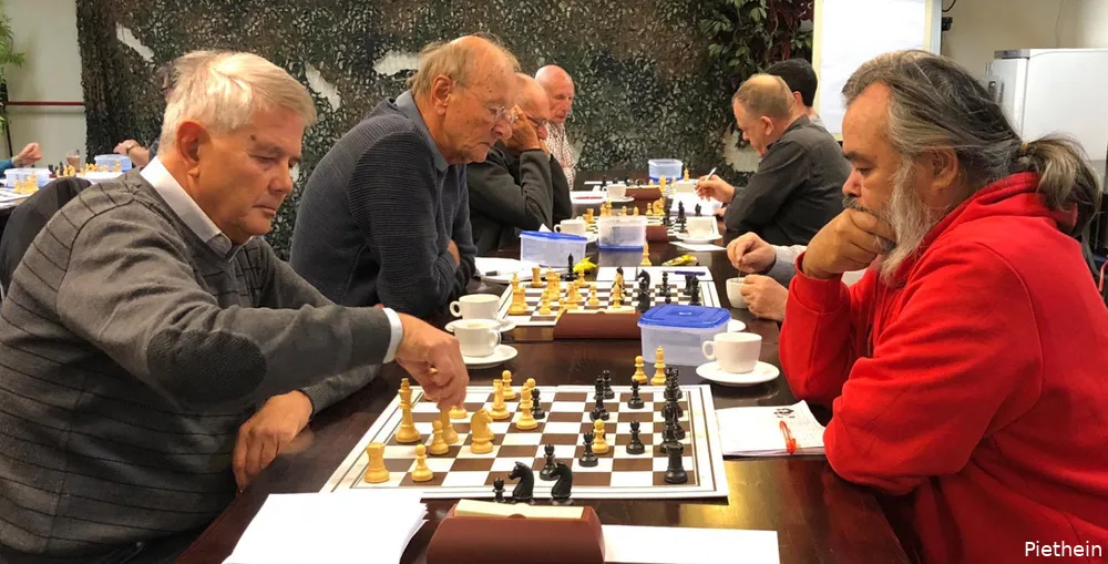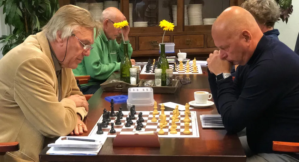 Alhoewel de senioren van het Veluws Schaakgenootschap Ermelo (VSG) geen herfstvakantie op de agenda hadden, waren er dinsdagavond 23 oktober, twintig afmeldingen, maar desondanks zeventien partijen. Koploper Gerard de Hoop deed als witspeler goede zaken tegen Mark de Graaf (3) en won.