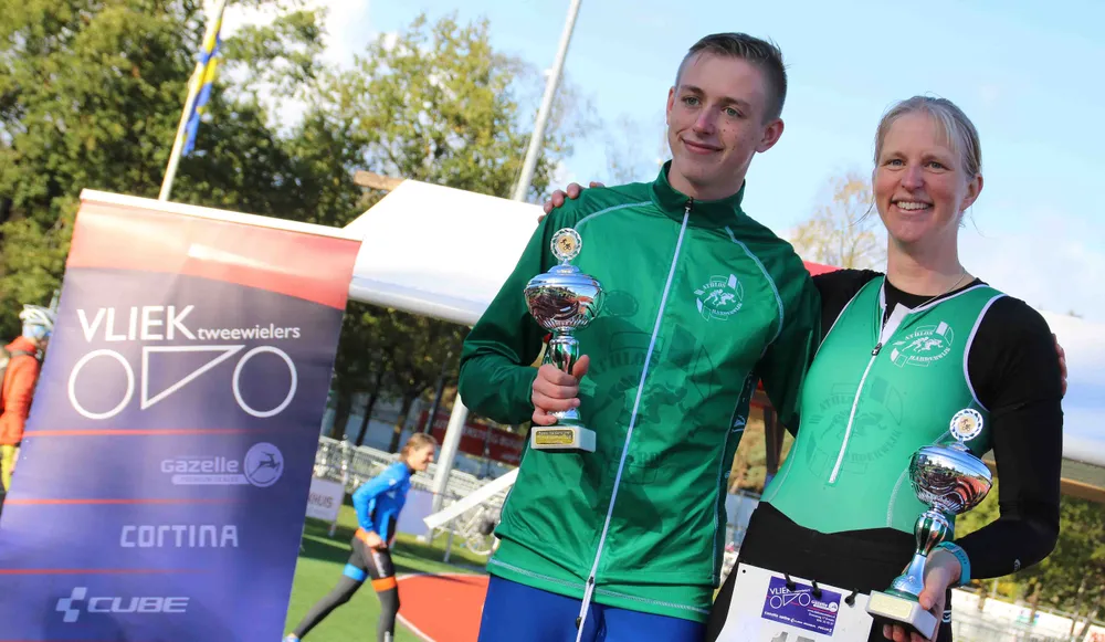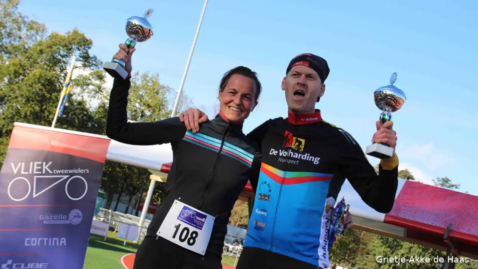 Tanya Pit en Albert Poortinga hebben vanochtend, zaterdag 27 oktober, de prijs in de wacht gesleept als Beste Ermeloer in de categorieën vrouw en man bij Athlos Vliek RunBikeRun. De RunBikeRun bleek een pittige uitdaging met eerst 2,5 km hardlopen, vervolgens 12 km mountainbiken, om af te sluiten met 2,5 km hardlopen, op en rond de atletiekaccommodatie van Athlos aan de Strokelweg 9 in Harderwijk, op de grens van Ermelo.