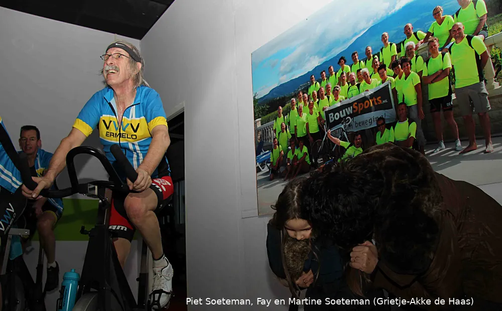 Alexander is de kleinzoon van Piet Soeteman, één van de leden van de VWV die zelf natuurlijk ook mee fietste. In mei 2015 kreeg hij te horen dat zijn kleinzoon neuroblastoom heeft, een ernstige vorm van kinderkanker met uitzaaiingen. Martiene, de vrouw van Piet en oma van Alexander, kwam vanmiddag even kijken bij de spinningmarathon. Zij bracht Fay mee, de driejarige zus van Alexander. Voor de peuter die net zo goed een hele zware periode meemaakt nu haar broertje zo ziek is, was de opzwepende muziek die de marathon begeleidde zo overweldigend, dat ze zich verstopte in de jas van haar oma.