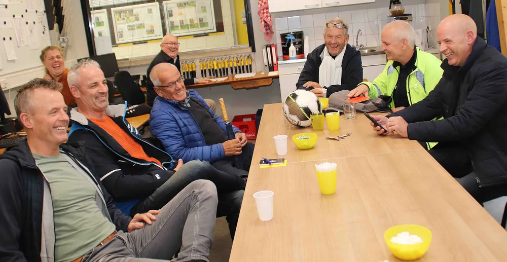 De sfeer werd steeds joliger vanmiddag, zaterdag 6 november, in de ontvangstruimte van de scheidsrechters bij voetbalvereniging DVS'33, toen de gebroeders van Leeuwen: Wim, Dick (55), Cor (57) en Nico (62), één voor één de binnen kwamen druppelen. Waren ze wellicht enigszins opgewonden over hun ludieke actie die meer scheidsrechters moet trekken voor de lagere elftallen? "Ik niet", grijnsde Wim, "maar Dick des te meer."