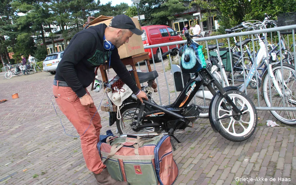 Als vanouds werden vandaag, zaterdag 2 september, veel koopjes gescoord bij de Boeldag Ermelo, die voor de 51e keer werd gehouden. Een jonge man maakte het wel heel bont. Hij had zijn Tomos brommer zó afgeladen met huisraad, dat een Boeldag-vrijwilliger hem een zetje moest geven voor de nodige snelheid om het terrein te verlaten.