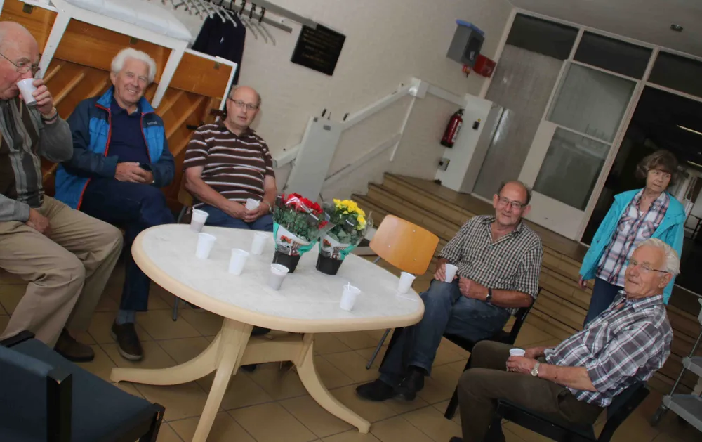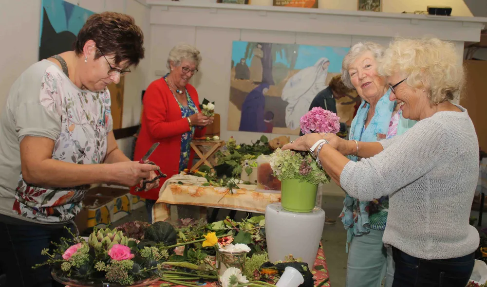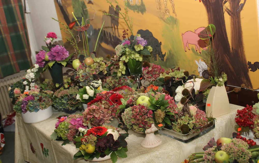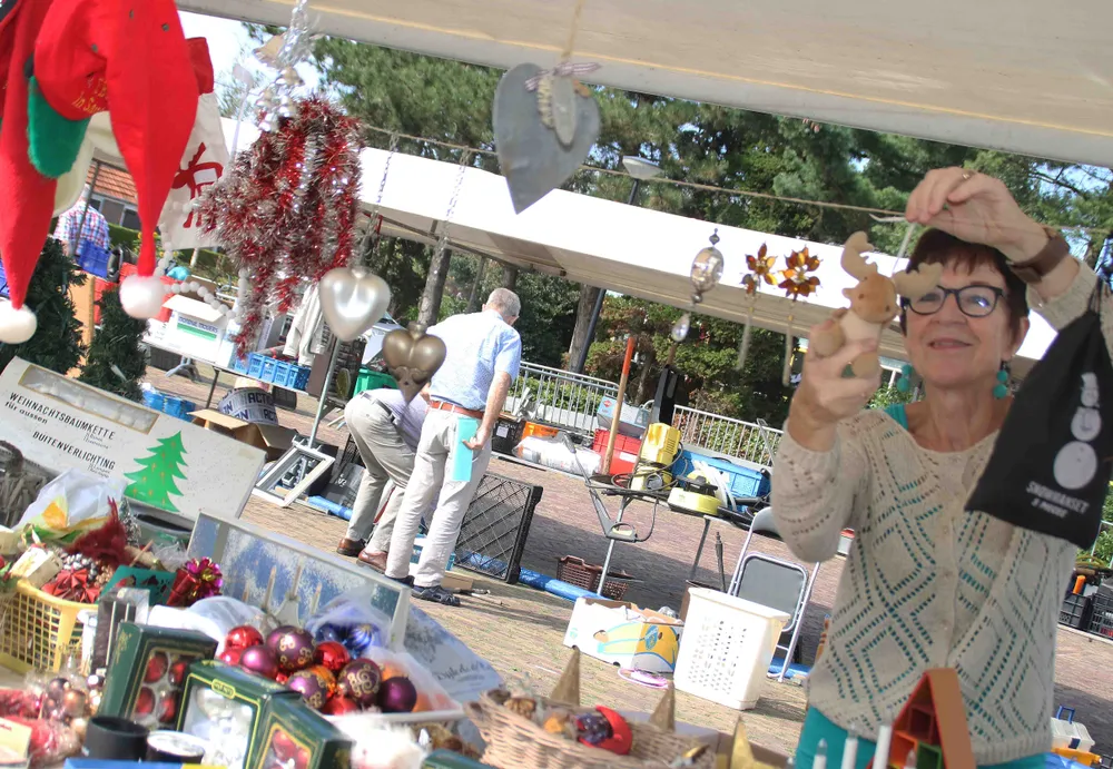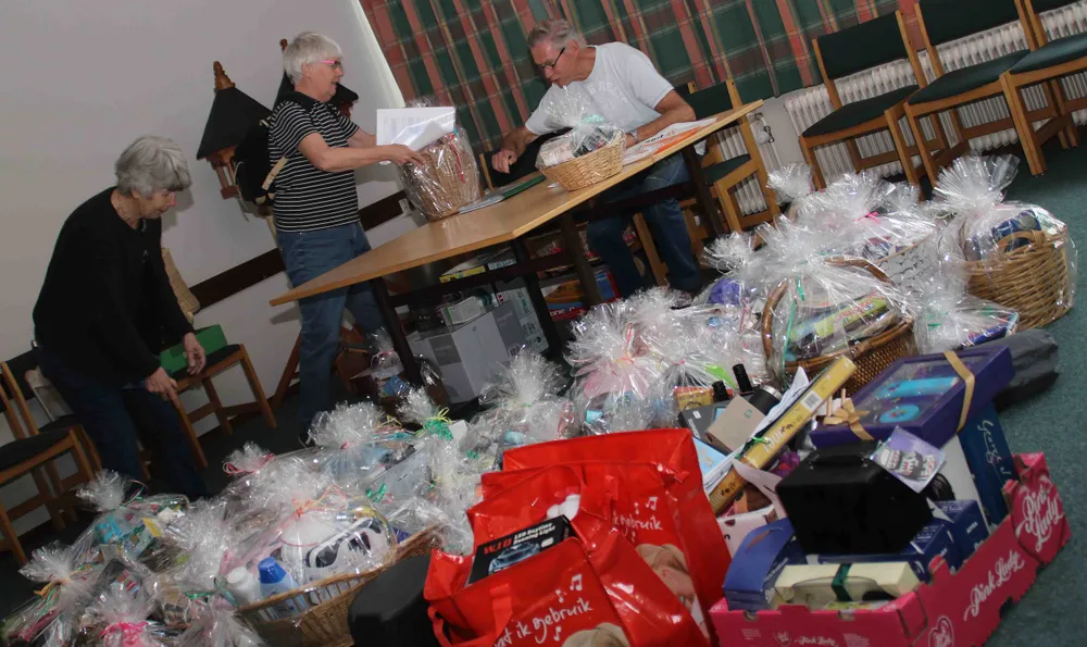 In een bijzaal schikt een clubje vrouwen erg fraai uitziende bloemstukken. Wie er eentje wil bemachtigen moet er morgen rap bij zijn. Want in de bloemenwinkel betaal je zo het viervoudige voor al dat moois. De zaal ernaast is het domein van de goed gevulde cadeaumanden die zijn te winnen met het rad van fortuin. Kunstig zijn daarnaast de vogelhuisjes op een paal, gemaakt van afvalmateriaal. Erg praktisch is bovendien dat het dakje kan worden geopend om 'de boel' schoon te houden.