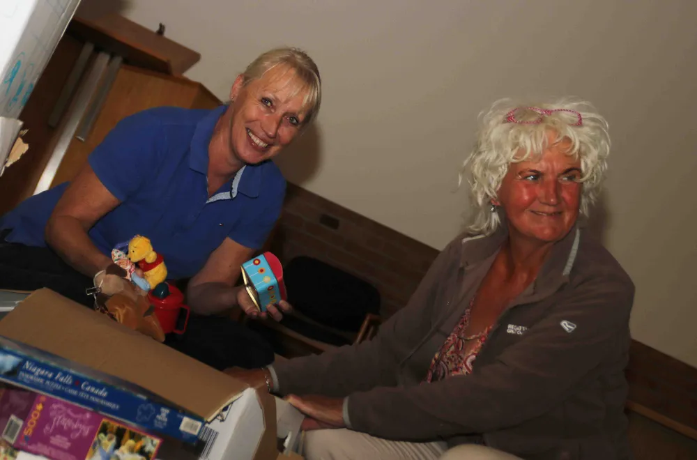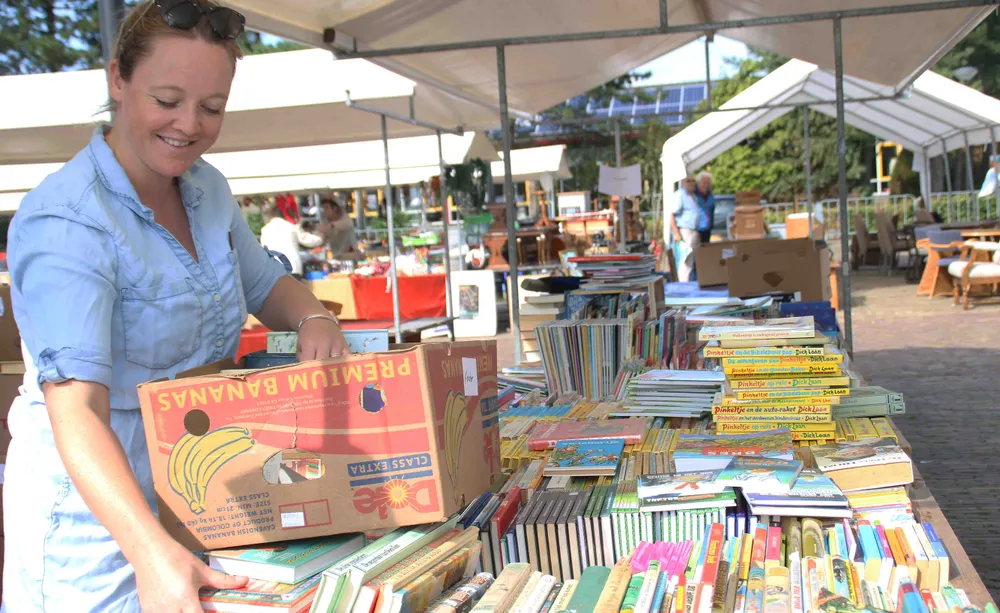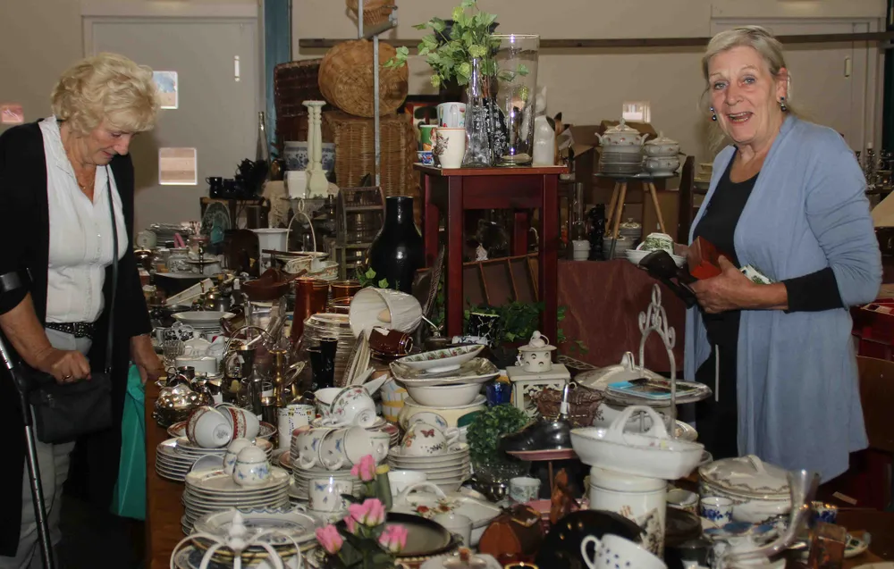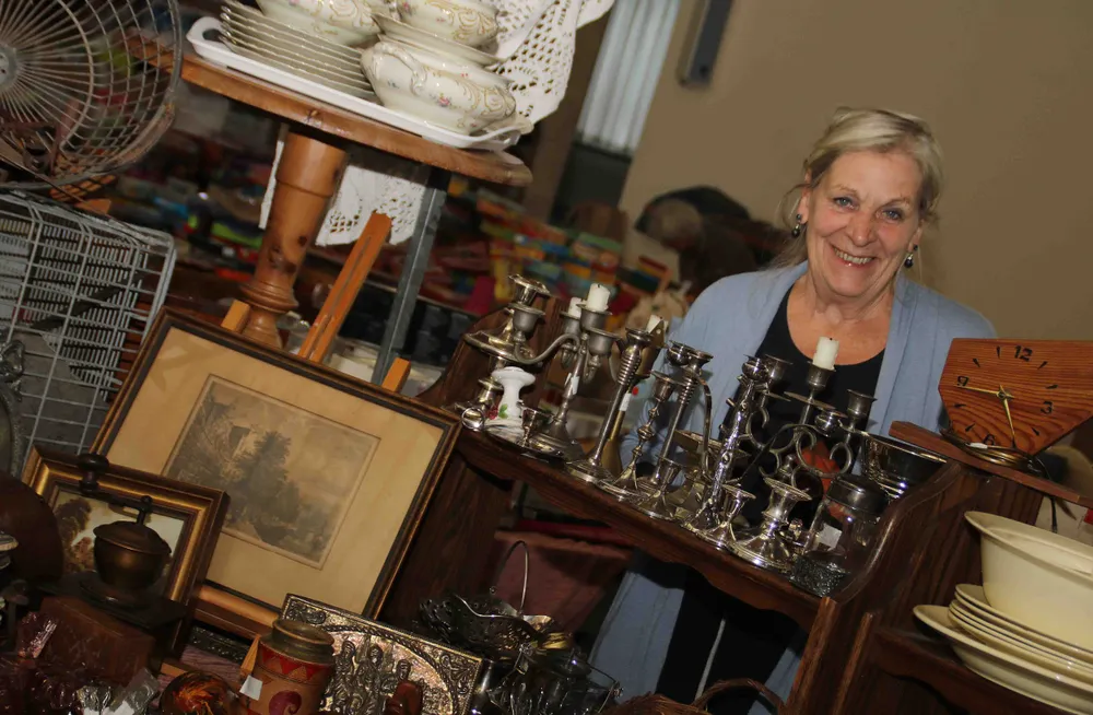 In de kerkzaal wordt fanatiek gewerkt aan de meest mooie ingerichte kramen. Vol trots worden ze regelmatig van een afstand bekeken. Want de dames weten dat het oog van de bezoekers ook wat wil. Jonna van de kraam met schilderijen en curiosa heeft met haar spullen iedereen heel veel bijzonders te bieden. Voor de liefhebber ligt er een zilveren bestekcassette van het merk Gero voor een klein prijsje klaar.