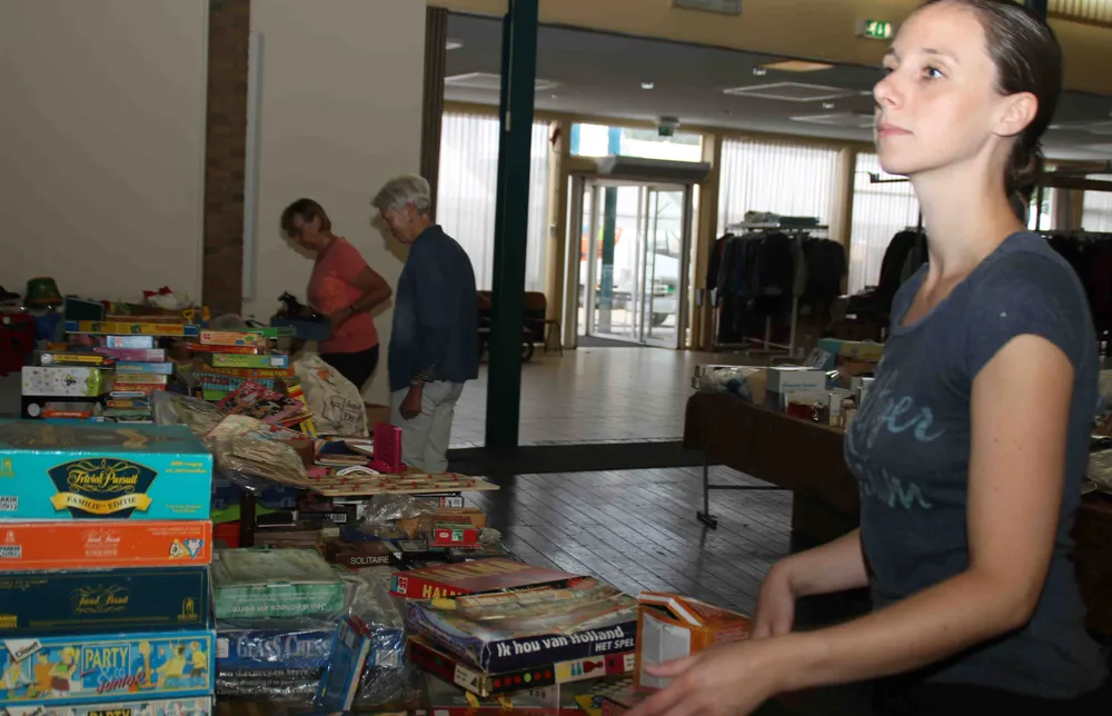 In het Kerkelijk Centrum vordert Houda Moghamiz gestaag met het inrichten van de kledingafdeling. Op een rij lange tafels liggen van broeken, T-shirts, blousjes tot truien keurig opgevouwen. Graai-klaar voor de dag van morgen. "Nou", lacht Houda, "bijna dan." Tegenover de tafels met kleding staat een rij met rekken die volhangen met colberts, jassen, rokken tot broeken. Voor ieder wat wils dus.