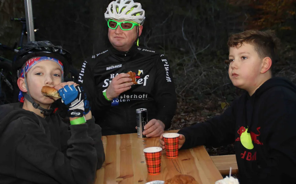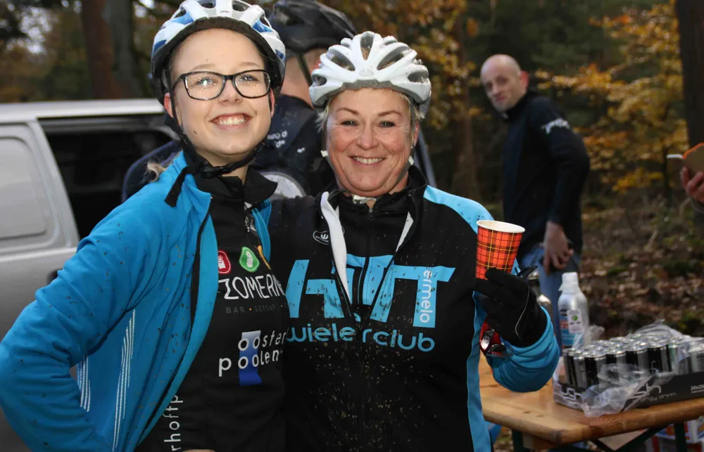 Kwart over 12 fietsen de eerste deelnemers binnen. Ze waren erg enthousiast over het eerste deel van de tocht. Én vies, de een nog erger dan de andere. Vooral de mannelijke deelnemers bleken echte 'modderpieten' om maar even in het Sinterklaas-sfeertje te blijven. Een vrouwelijke MTB-er lachte: "Die hebben waarschijnlijk net iets harder gefietst dan wij."